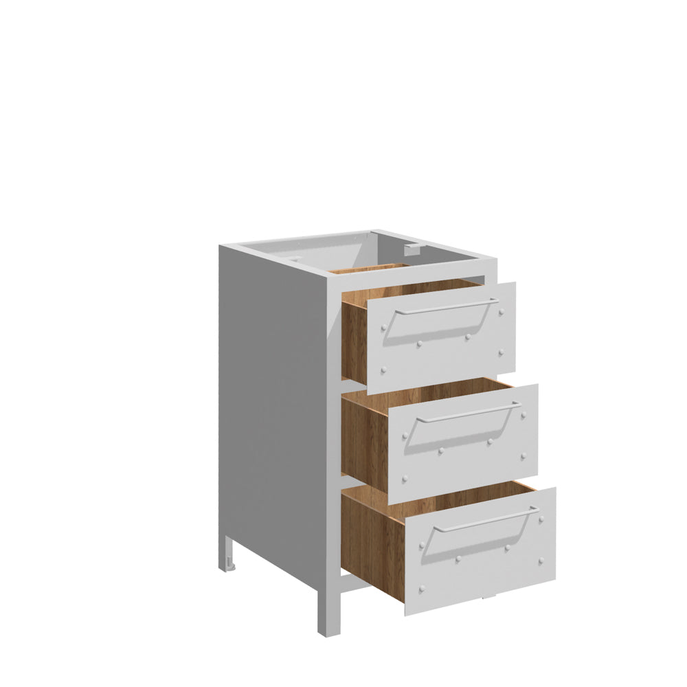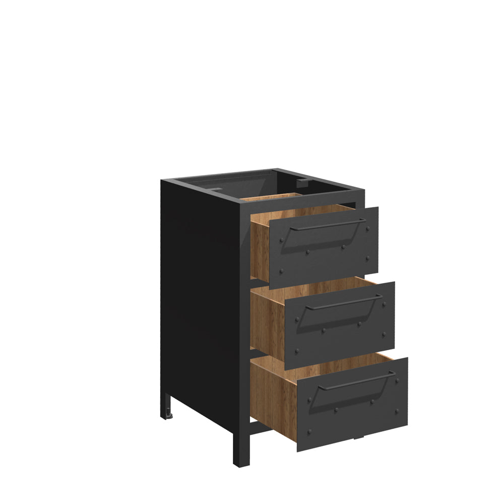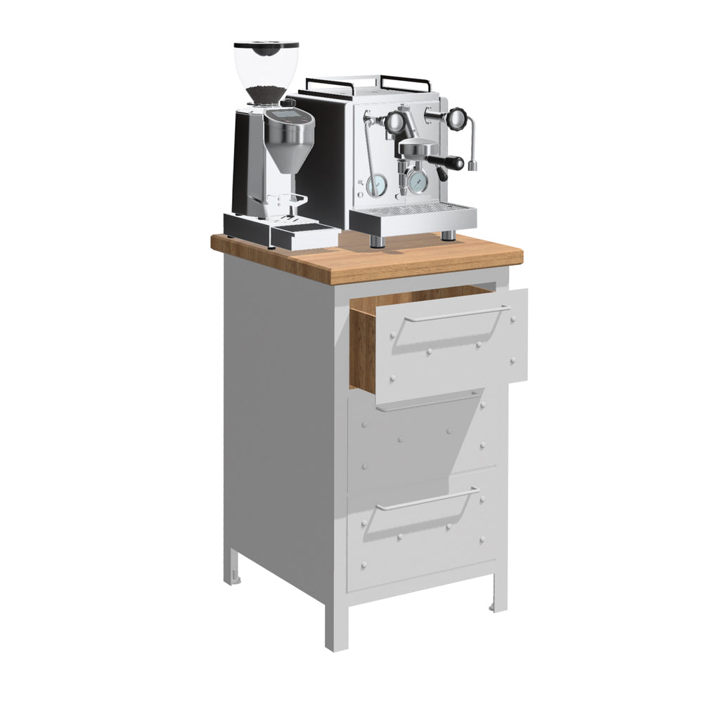 Baristra-Bar / Espresso-Konsole – Stahlkorpus mit drei unterschiedlich grosse Schubladen. Die Front aus Stahl, mit den typischen Nieten, die Schublade selbst aus Massivholz. Der Schubladenschrank kann mit anderen Noodles-Küchenmöbeln kombiniert werden. Bestellbar mit und ohne Arbeitsplatte. Die Höhe des Metallkorpus beträgt 91cm. Fester Stand auch bei unebenem Boden durch höhenverstellbare Stellfüße.