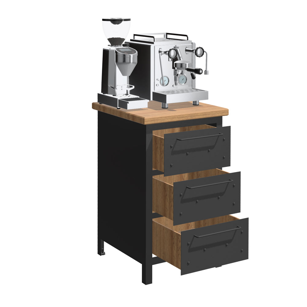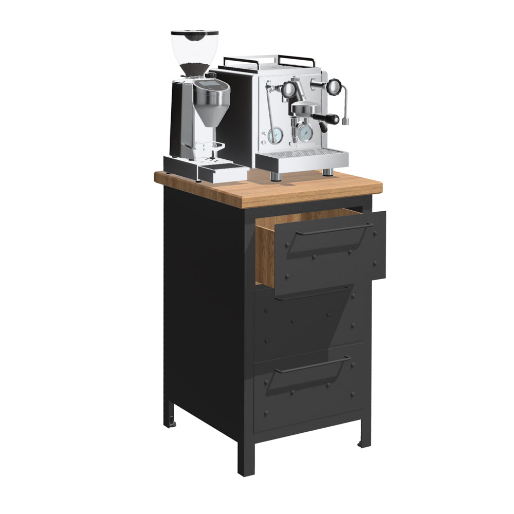 BARISTA-BAR / ESPRESSO-KONSOLE 500 TYP 2 – von Noodles Noodles. Solider Schubladenschrank aus Stahlwinkeln, Nieten und Stahlblech mit drei gleich hohen Schubladen aus Holz. Gefertigt aus dunklem Stahl mit typischer Zunderschicht und transparenter Versiegelung. Alternativ mit seidenmatter Lackierung in Reinweiss. Die Lackoberfläche ist robust und pflegeleicht. Die fast 4 cm starke Kiefernholzplatte stammt aus nachhaltiger Forstwirtschaft. Das Holz wird mit einem hochwertigen Naturölprodukt oberflächenbehandelt und ist somit gegen Feuchtigkeit und Wasser versiegelt. Flexibel in der hauseigenen Küche, Coworking Spaces, Büro Kaffeeküche, Gastronomie etc. einsetzbar.