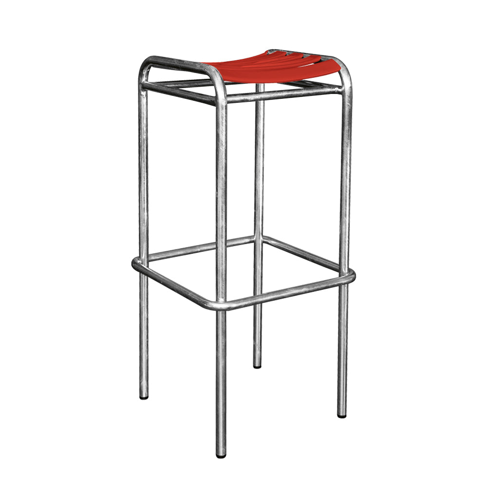 BARHOCKER MODELL 25 VON BÄTTIG – aus feuerverzinktem Rundrohr Ø 22mm mit 5 aufgezogenen PVC-Leisten. Füsse mit Kunststoffgleiter ausgerüstet. Dieser Barhocker ist ideal für den Aussenbereich und wird auf Terrassen, Garten im öffentlichen wie auch privaten Raum genutzt. Ist auch ideal für die Gastronomie in Beizen, Bars und Restaurant.