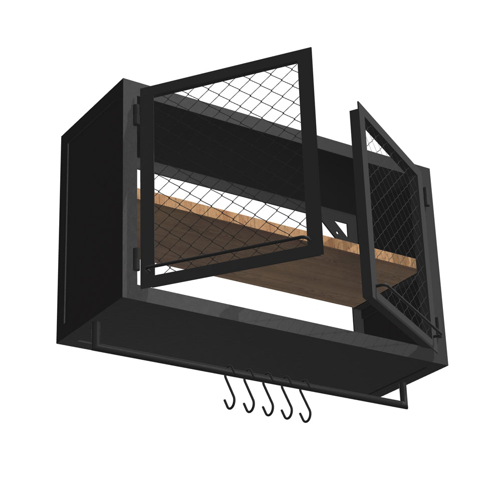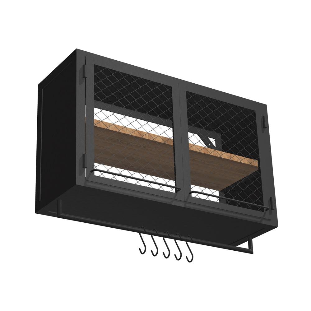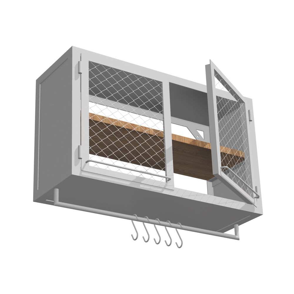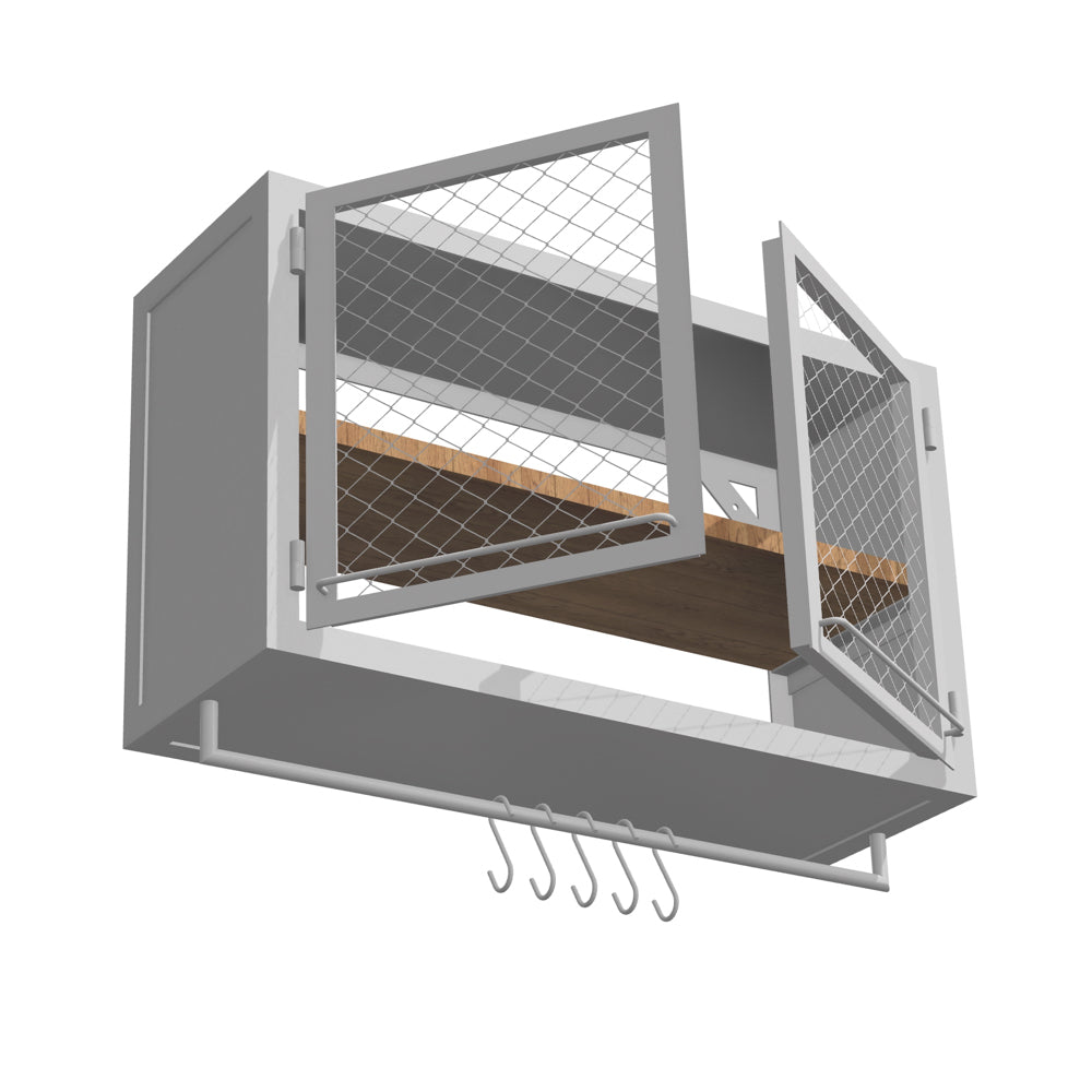 KÜCHENWANDSCHRANK PX MESH 100/60 MIT STANGE – von Noodles Noodles. Solider Wandschrank aus Stahlwinkeln, Nieten und Stahlblech. Doppeltürig. Innen sehr geräumig und mit einer Holzablage auf mittlerer Höhe ausgestattet. Gefertigt aus dunklem Stahl mit typischer Zunderschicht und transparenter Versiegelung. Alternativ mit seidenmatter Lackierung in Reinweiss. Die Lackoberfläche ist robust und pflegeleicht. Der Küchenwandschrank kann in eine Küchenzeile integriert werden oder auch alleine stehen. Flexibel in der hauseigenen Küche, Coworking Spaces, Büro Kaffeeküche, Gastronomie etc. einsetzbar.