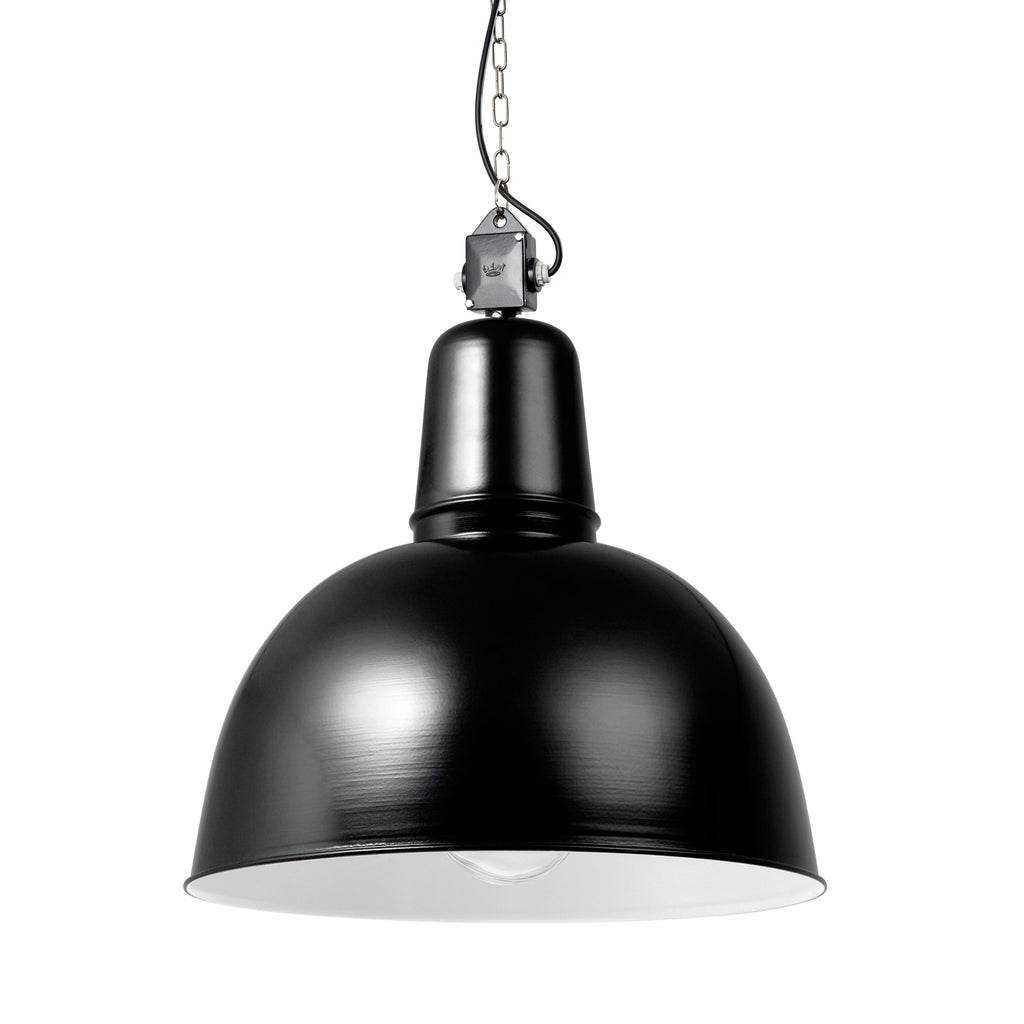 KÖLN ZYLINDER OUTDOOR - Industrielampe aus veredeltem Stahlblech, aussen Tiefschwarz, innen Reinweiss, inkl. schwarzes 1,5 m Textilkabel und Metall-Baldachin Halbkugel Ø 80 mm.