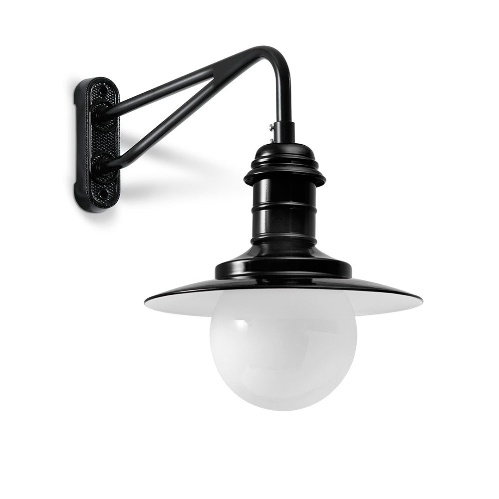 Eine robuste Leuchte mit flachem Reflektor und Schraubglas in Zylinderform. Aus traditionell gefertigten Guss- und Drückteilen sowie einzelnen Porzellanelementen. Dort, wo noch Wert auf klassische Details gelegt wird, ist sie nicht wegzudenken.