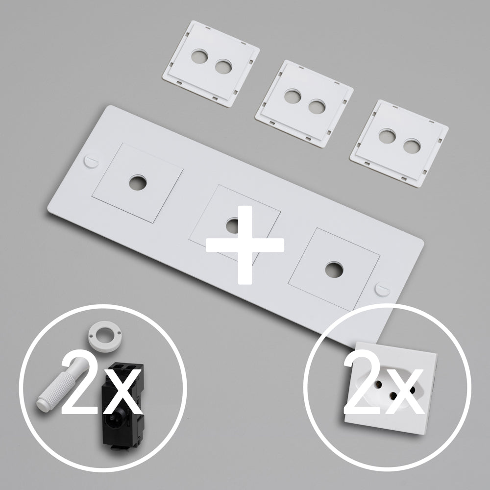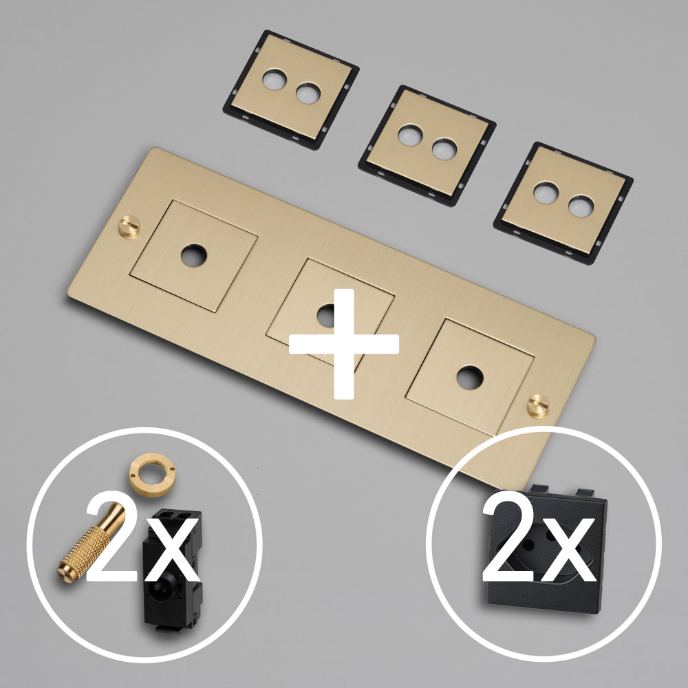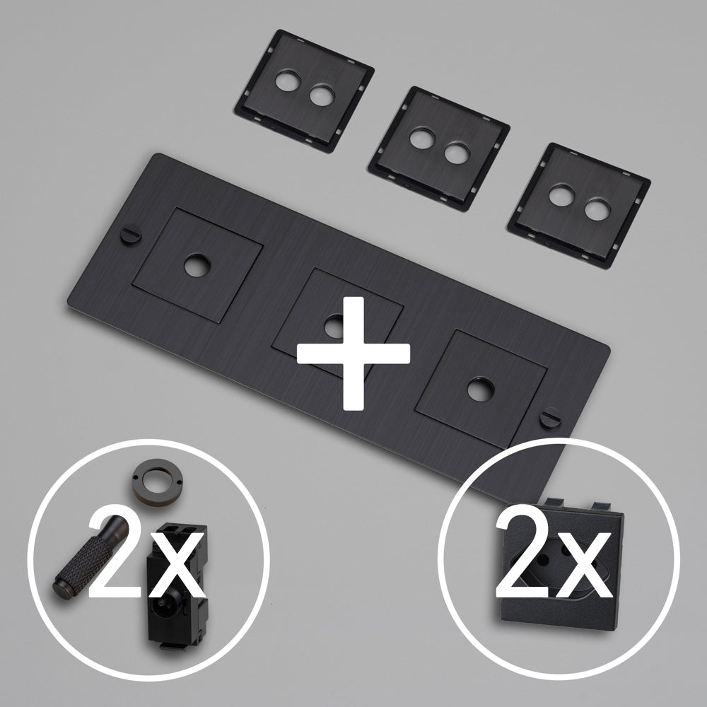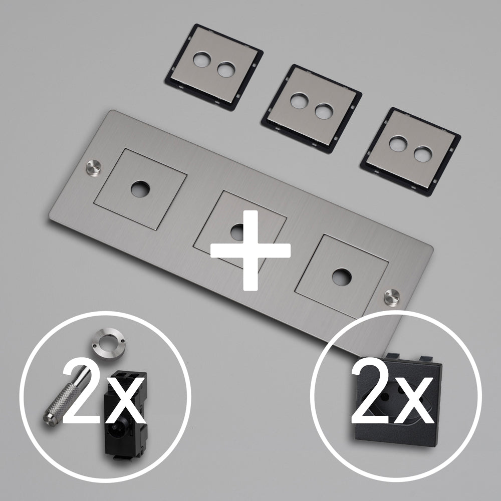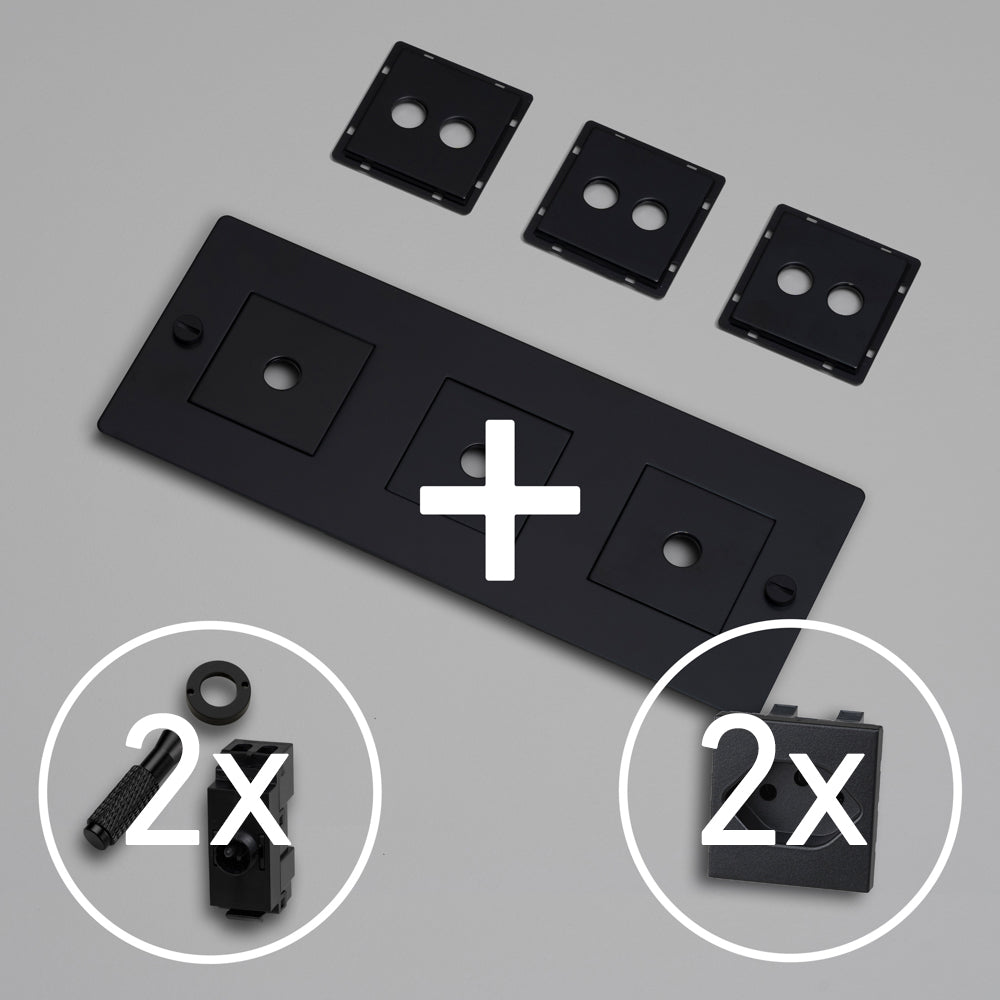 KIT 3G DOPPEL-KIPPSCHALTER MIT 2x STECKDOSE TYP J (T13) – Schweizer Standard Steckdose mit weiss oder schwarzem Modul. Es wird mit einer Auswahl an Detail-Kits aus massivem Metall geliefert, darunter ein Dimmerknopf und Münzschrauben.