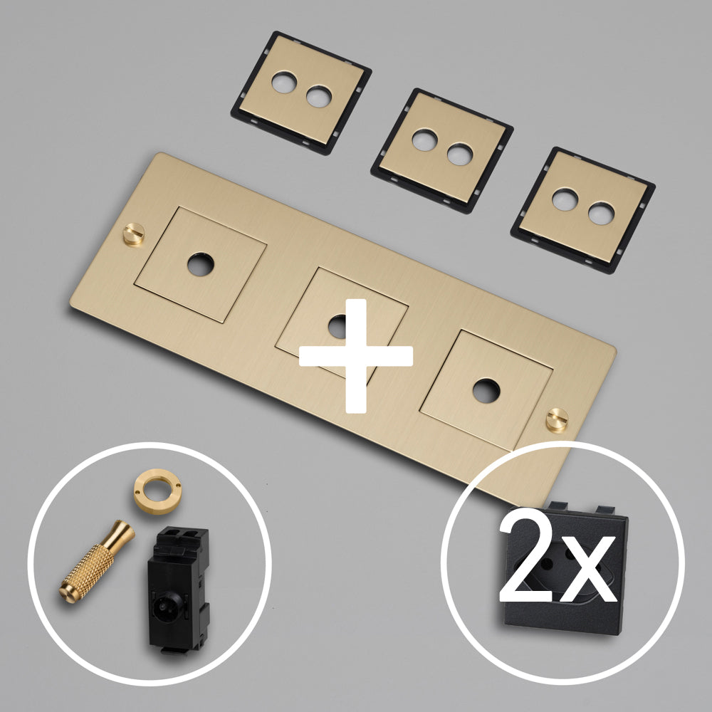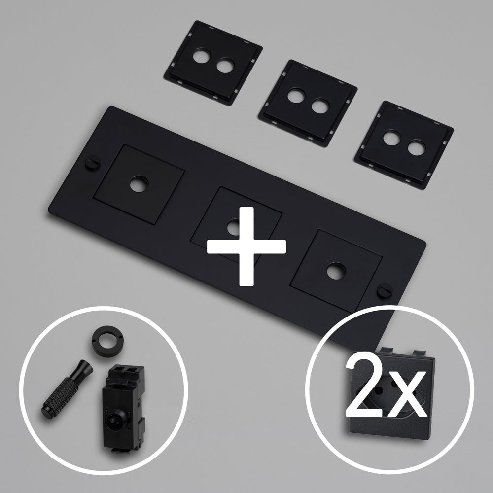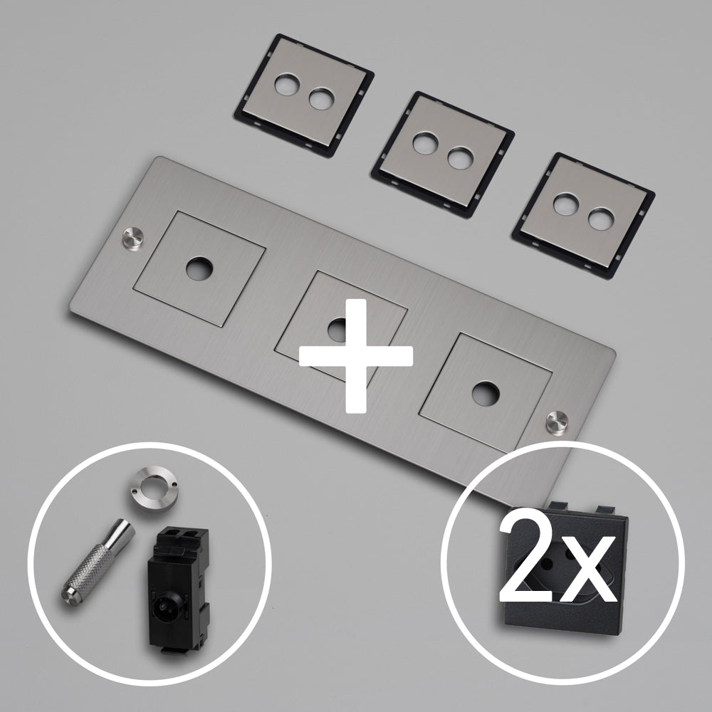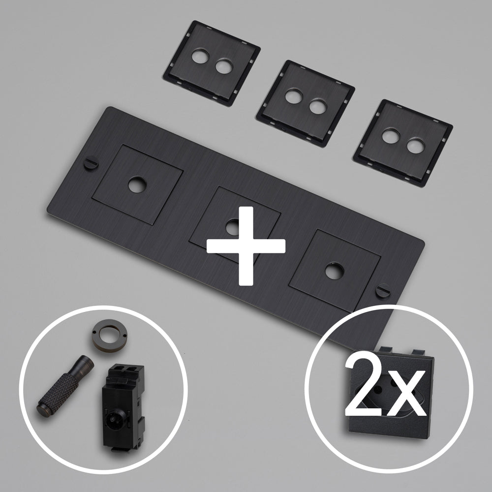 KIT 3G EINZEL-KIPPSCHALTER MIT 2x STECKDOSE TYP J (T13) – Schweizer Standard Steckdose mit weiss oder schwarzem Modul. Es wird mit einer Auswahl an Detail-Kits aus massivem Metall geliefert, darunter ein Dimmerknopf und Münzschrauben.