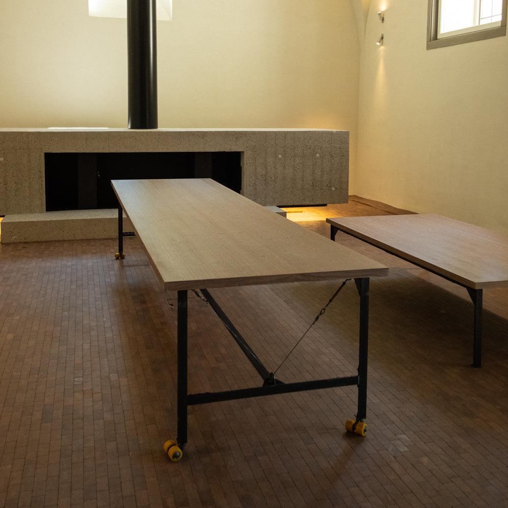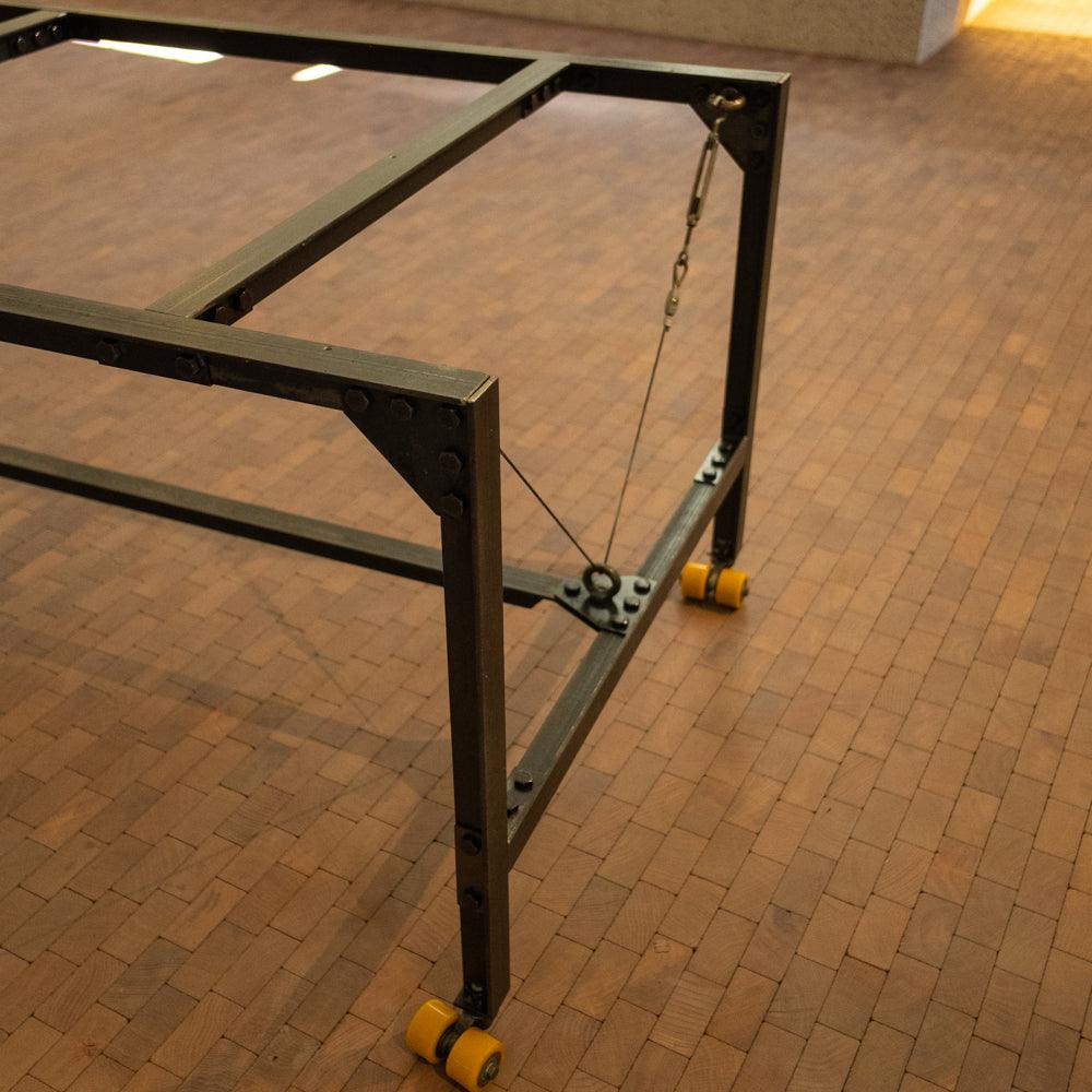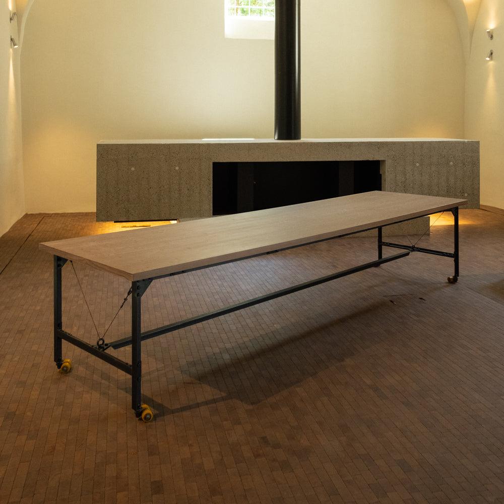 TISCH KONSTRUKTIV 16/40 3500/900 - Tischgestell aus Rohstahl, konstruktiv mittels Verbindungsplatten gebaut und sichtbar verschraubt. Der ganze Tischrahmen ist auf Rollen und wird mit einem Spezialöl versiegelt.
