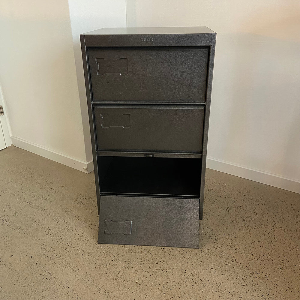 TOLIX CC3 AKTENSCHRANK / ARCHIVSCHRANK MIT 3 KLAPPEN (EINZELSTÜCK) (Classeur à clapets / Filing Cabinet)  Der Schubladenschrank von TOLIX wurde in den 1930er Jahren von Xavier Pauchard für industrielle und öffentliche oder private Einrichtungen entworfen und hat sich durch verschiedene Epochen und Stile zu einem Klassiker entwickelt, der im kollektiven Gedächtnis verankert ist.