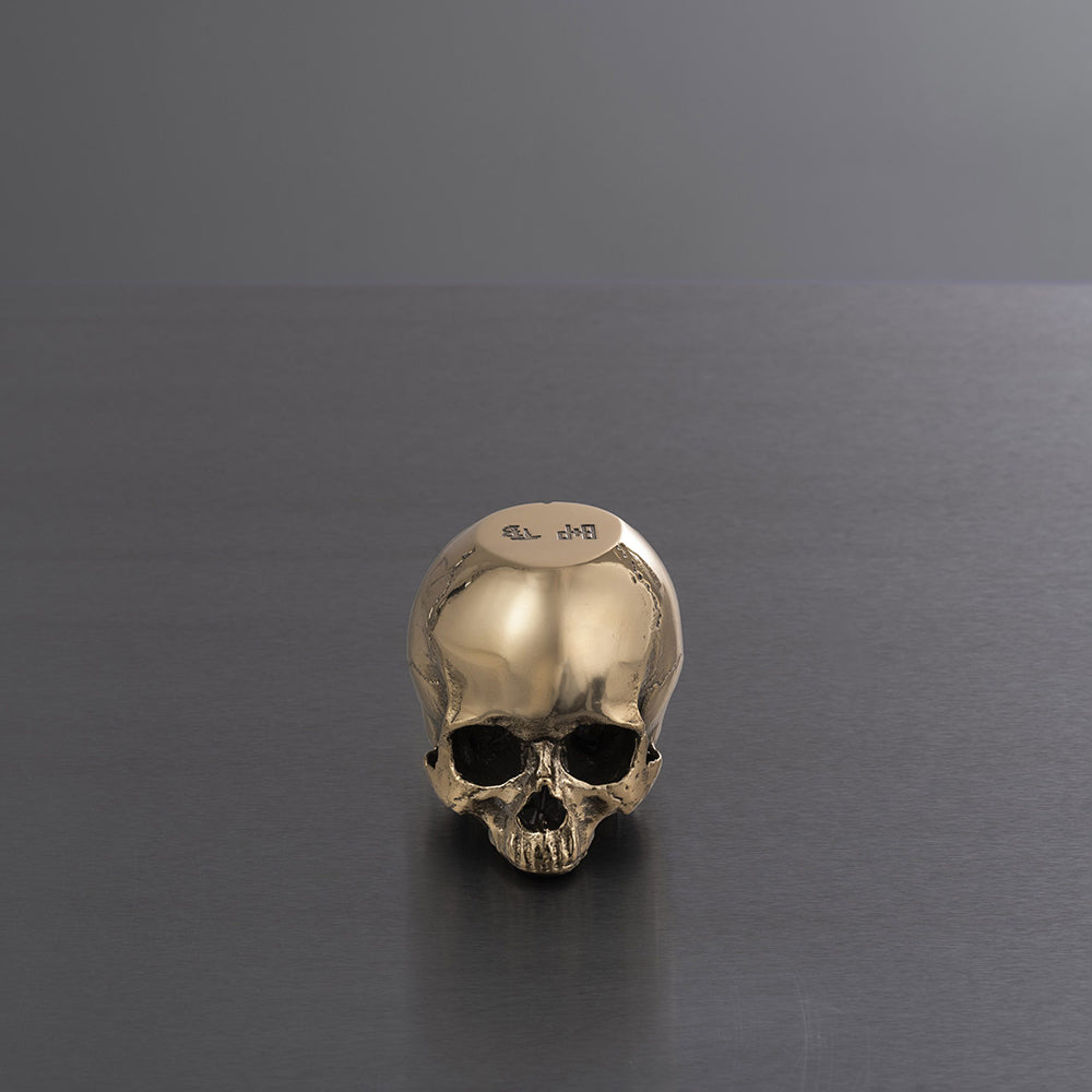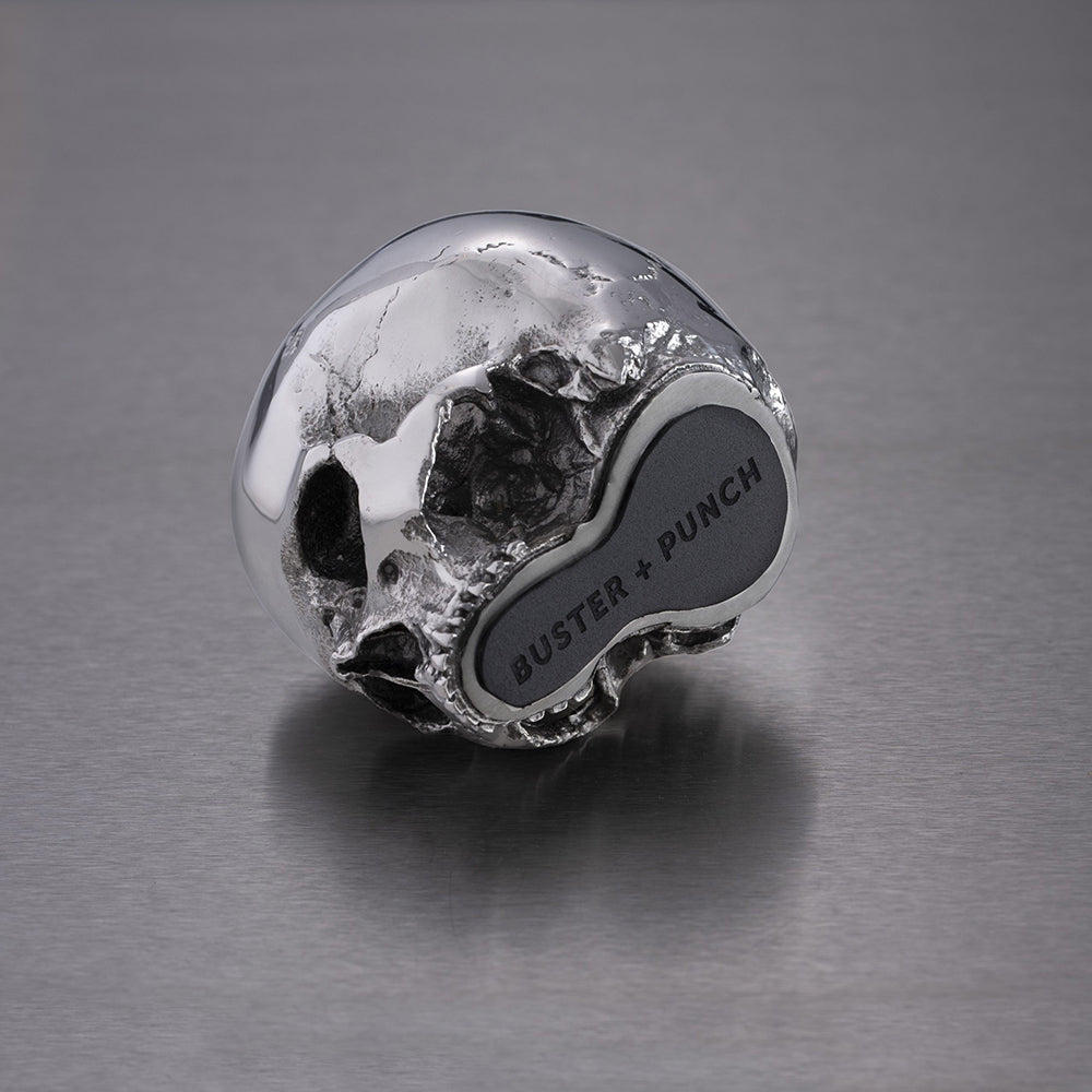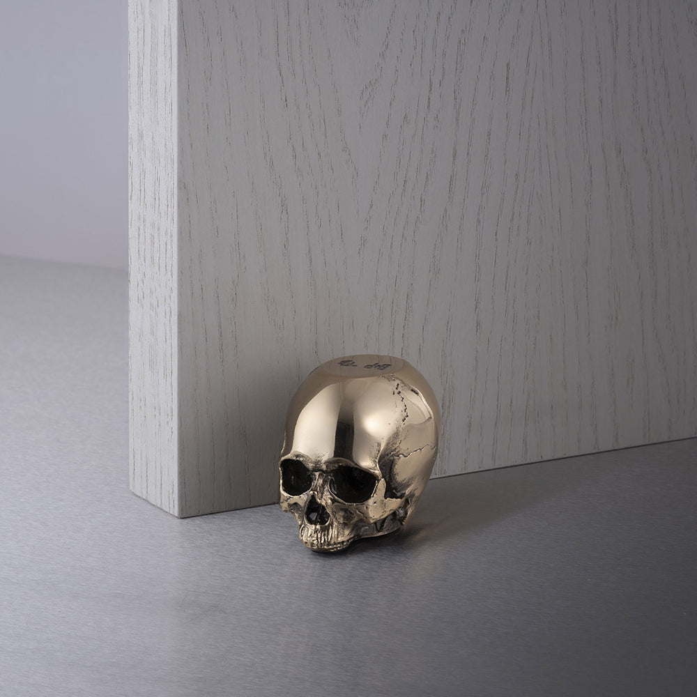 TÜRSTOPPER TRAVIS BARKER – SKULL DOOR STOP VON BUSTER & PUNCH – Ein freistehender Türstopper aus massivem Gussmetall mit Messing-EPL-Finish, poliert und von Hand veredelt. Es ist mit eingeprägten B+P- und TB-Insignien versehen und wird in einer schwarzen Seidentasche und einer Geschenkbox geliefert. Aufgrund der Art des Gussprozesses gleicht kein Stück dem anderen. Ein Travis Barker-Kollaborationsprodukt.