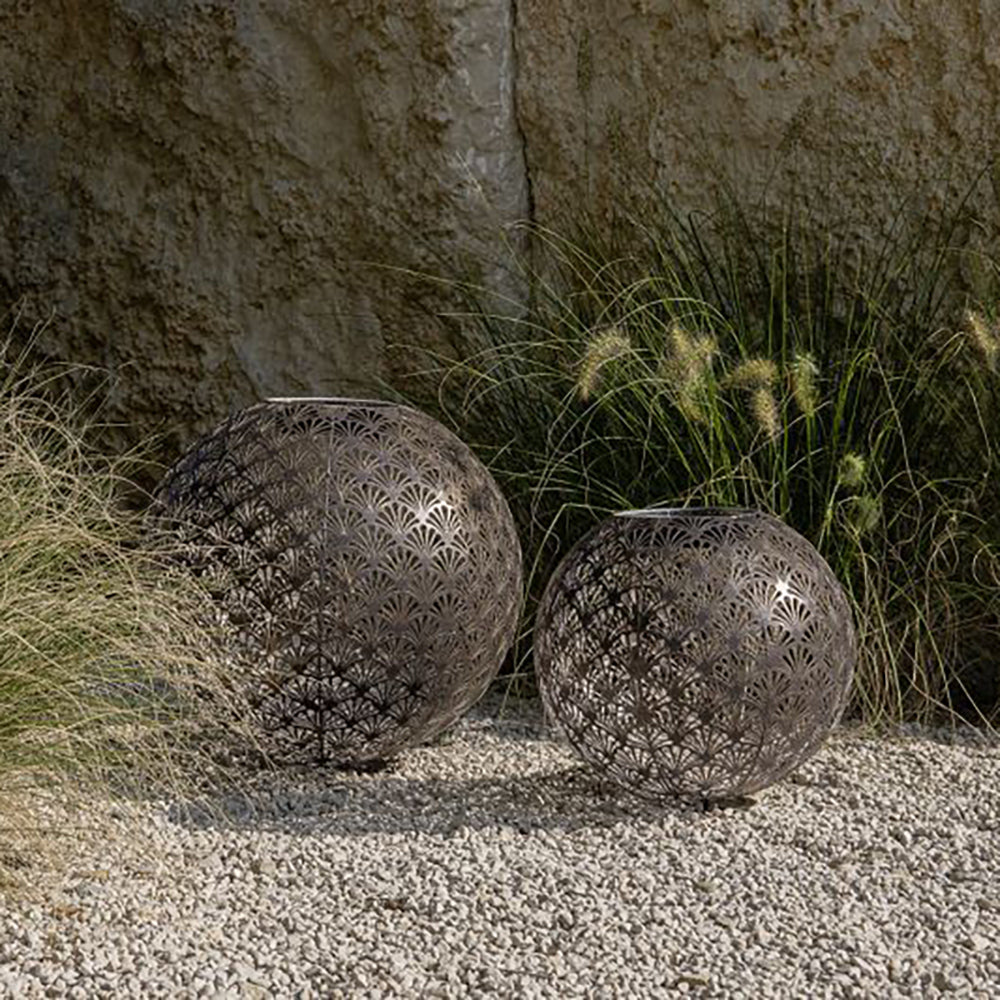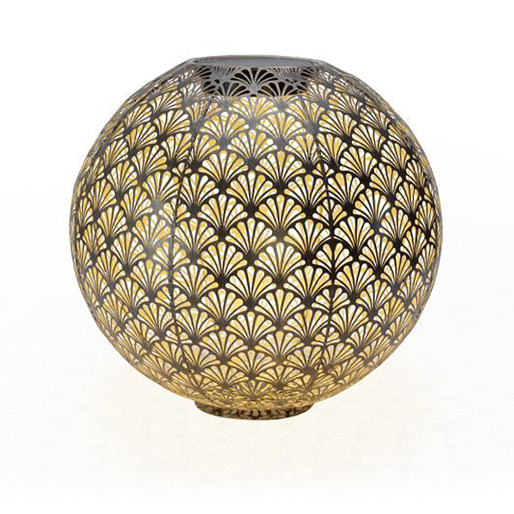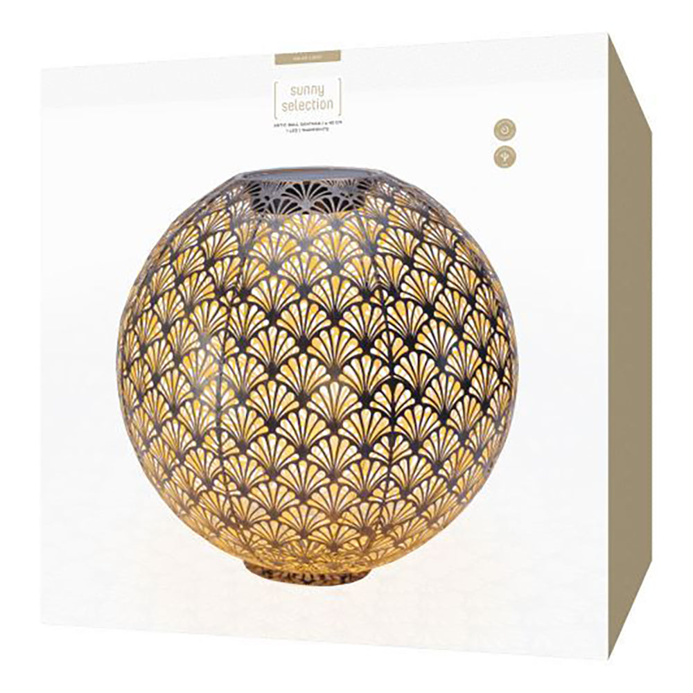 SOLAR-BALL 400 – ANTIC SANTANA – wunderschöne solarbetriebene Kugelleuchte für innen und aussen. Diese Solar-Lampe lädt sich im Verlaufe des Tages über das Solarpanel auf und schaltet sich am Abend bei Dämmerung automatisch ein. Das perforierte Metallgehäuse ergibt ein schönes Licht- und Schattenspiel. Die Solar-Leuchte kann bei jeder Witterung draussen stehen bleiben. Empfohlen wird, das in den Wintermonate die Leuchte im Innenbereich verwendet wird, da die Batterie gegen Minusgrade nicht resistent ist.