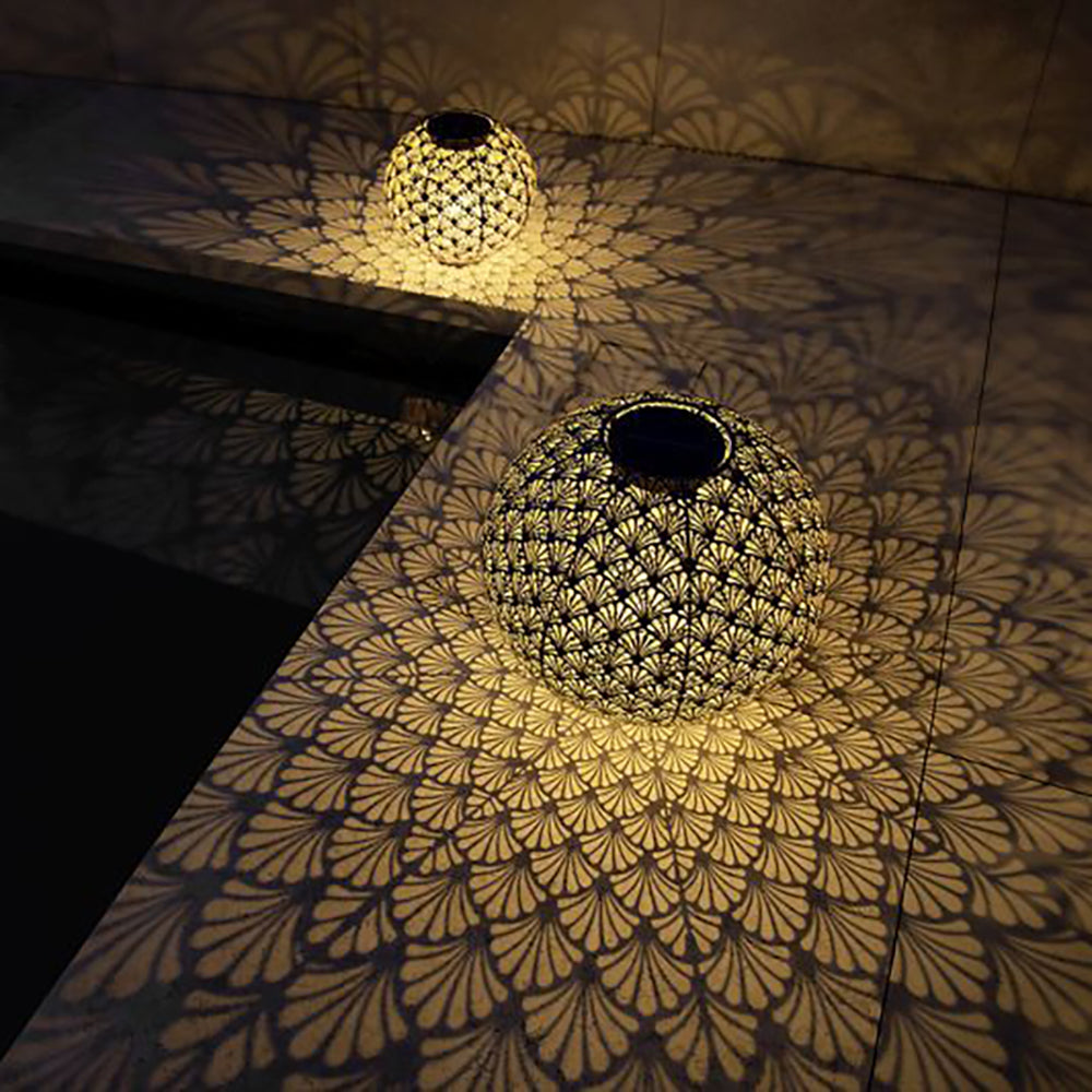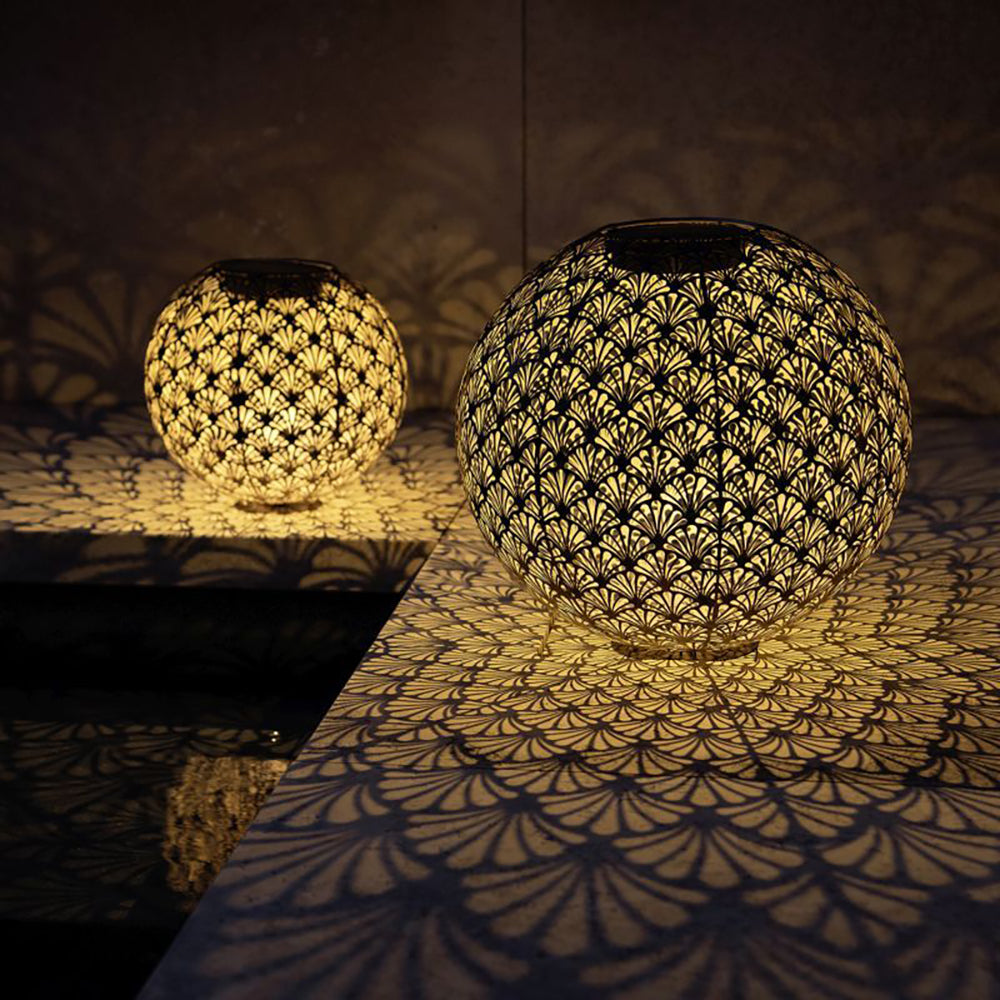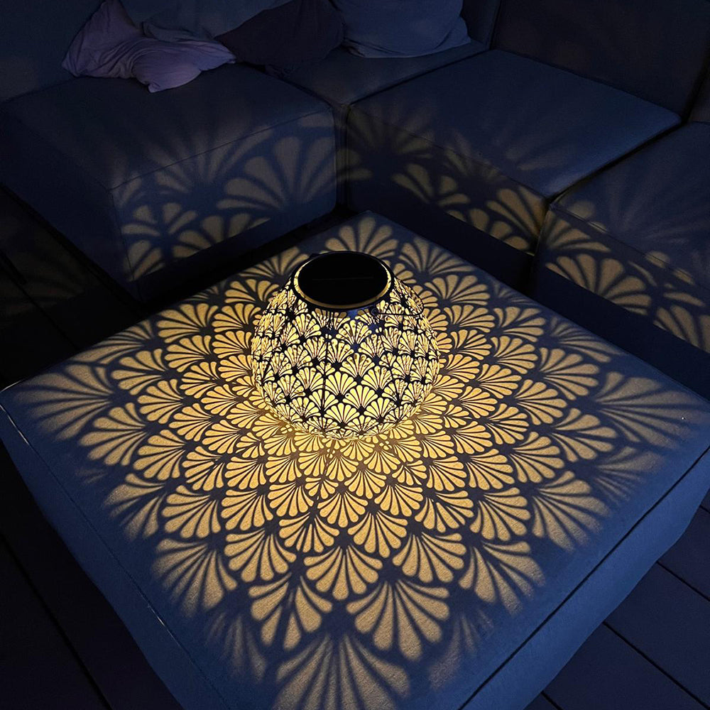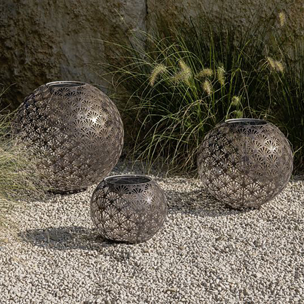 SOLAR-BALL 400 – ANTIC SANTANA – wunderschöne solarbetriebene Kugelleuchte für innen und aussen. Diese Solar-Lampe lädt sich im Verlaufe des Tages über das Solarpanel auf und schaltet sich am Abend bei Dämmerung automatisch ein. Das perforierte Metallgehäuse ergibt ein schönes Licht- und Schattenspiel. Die Solar-Leuchte kann bei jeder Witterung draussen stehen bleiben. Empfohlen wird, das in den Wintermonate die Leuchte im Innenbereich verwendet wird, da die Batterie gegen Minusgrade nicht resistent ist.