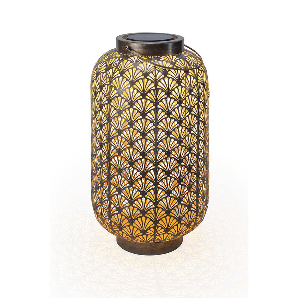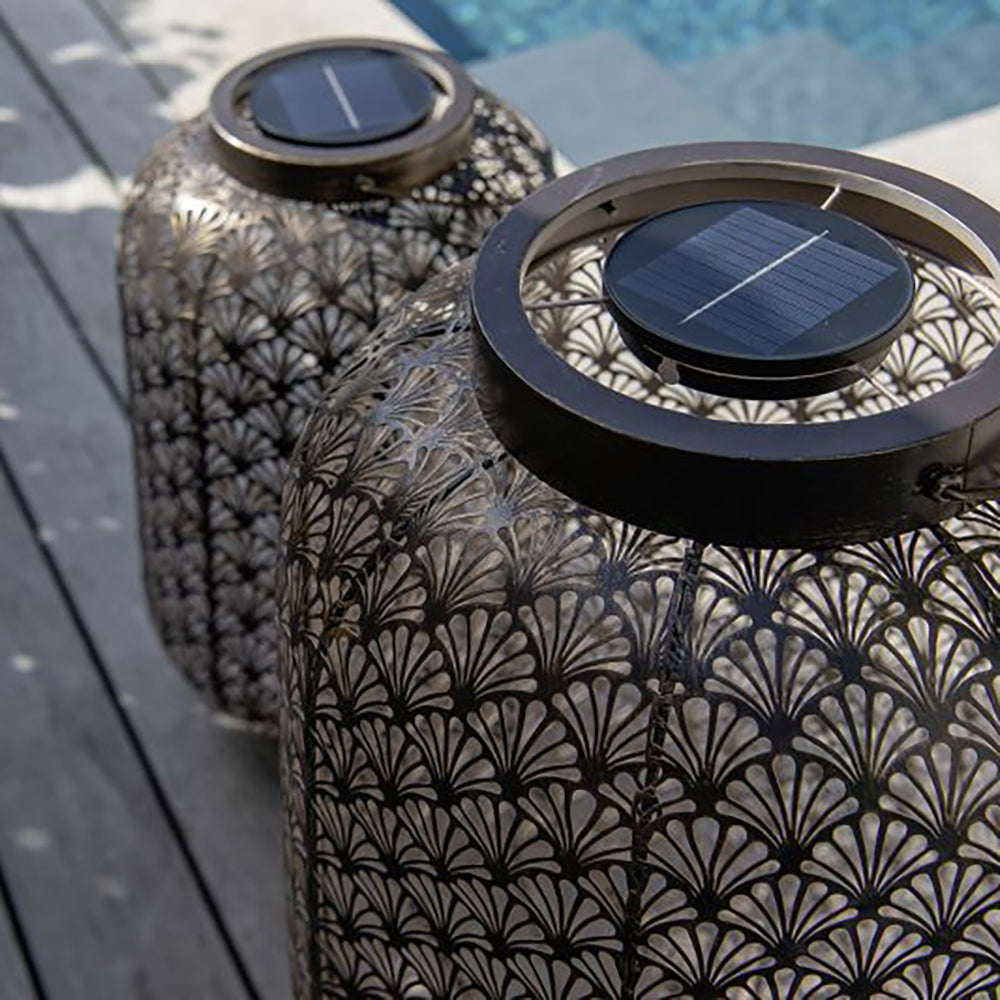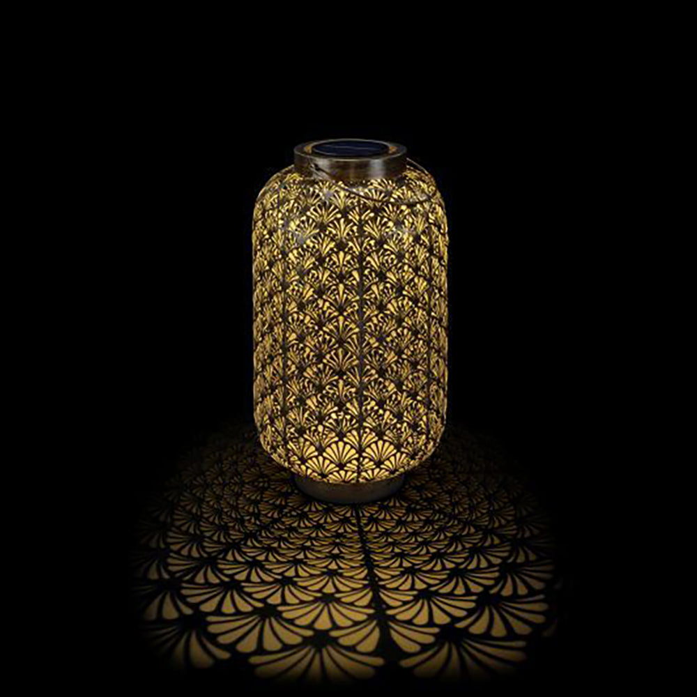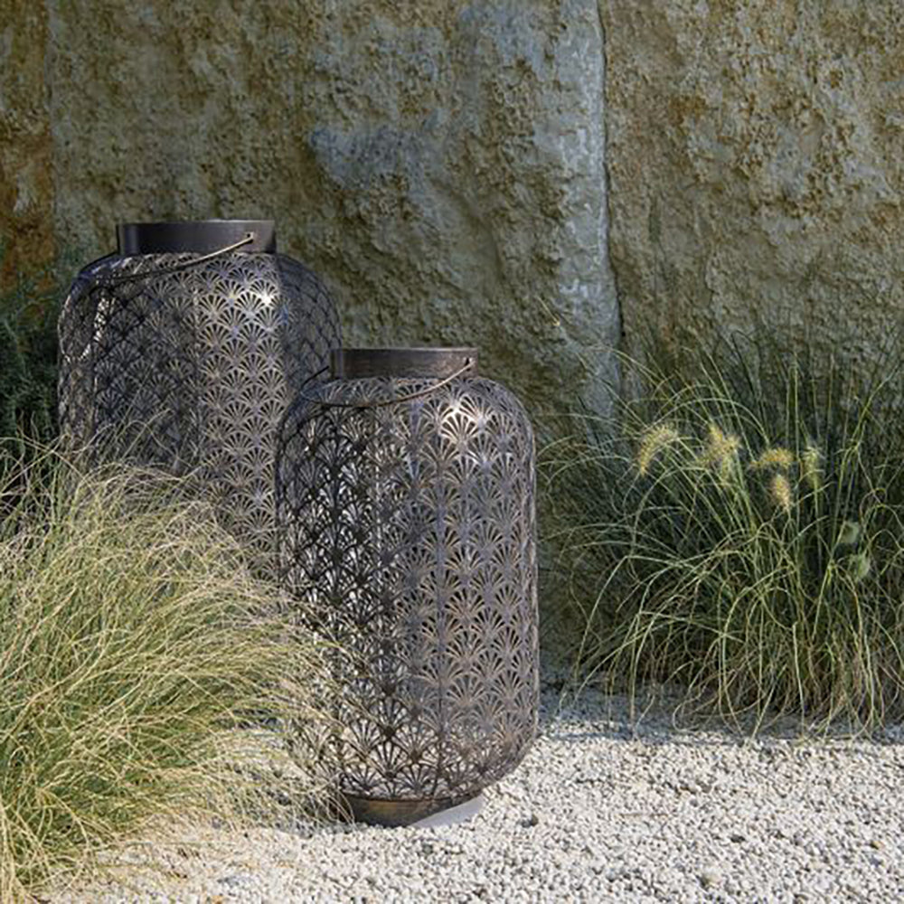 SOLAR-LATERNE GRAND 580 – ANTIC SANTANA – wunderschöne solarbetriebene Laterne für innen und aussen. Diese Laterne lädt sich im Verlaufe des Tages über das Solarpanel auf und schaltet sich am Abend bei Dämmerung automatisch ein. Das perforierte Metallgehäuse ergibt ein schönes Licht- und Schattenspiel. Die Solar-Laterne kann bei jeder Witterung draussen stehen bleiben. Empfohlen wird, das in den Wintermonate die Leuchte im Innenbereich verwendet wird, da die Batterie gegen Minusgrade nicht resistent ist.