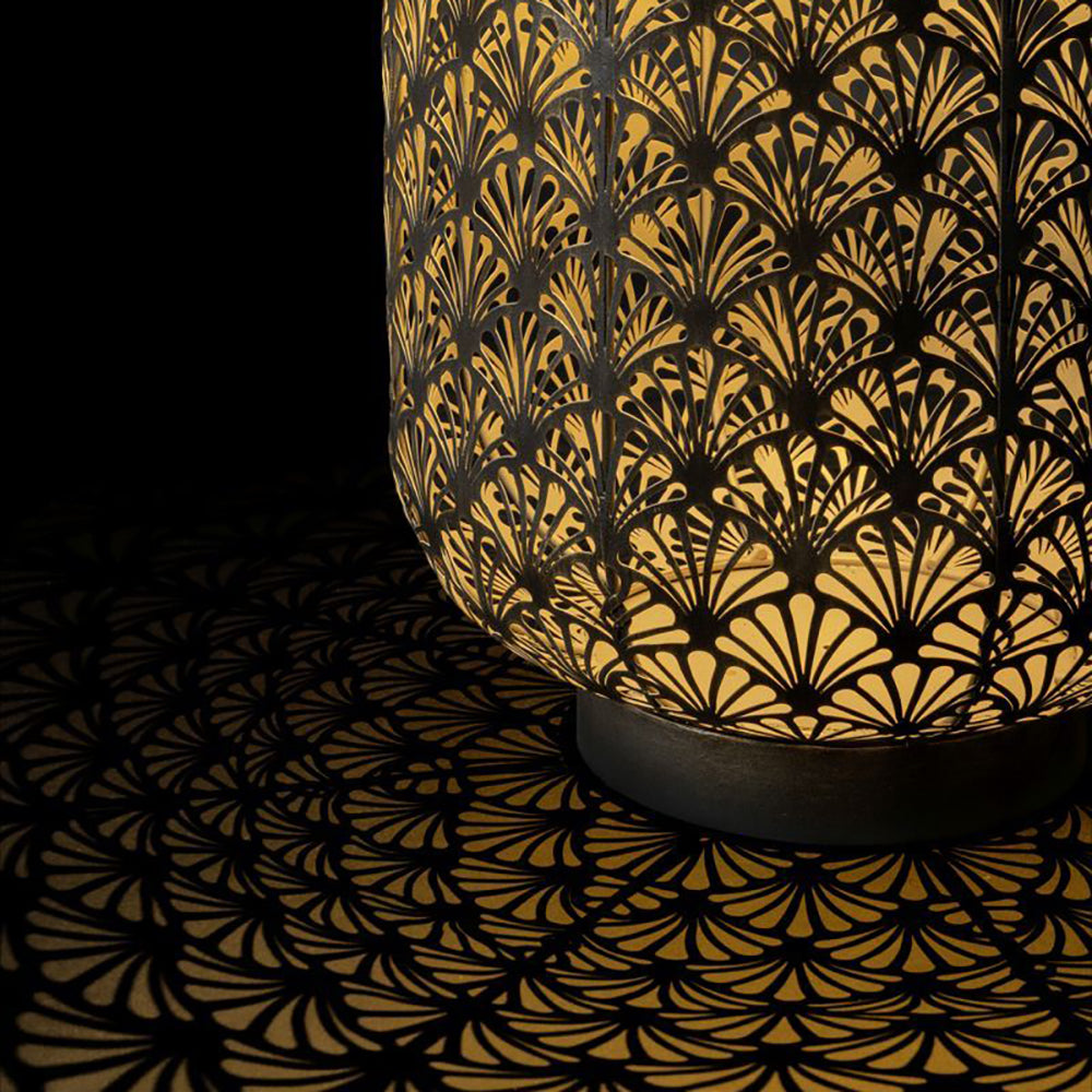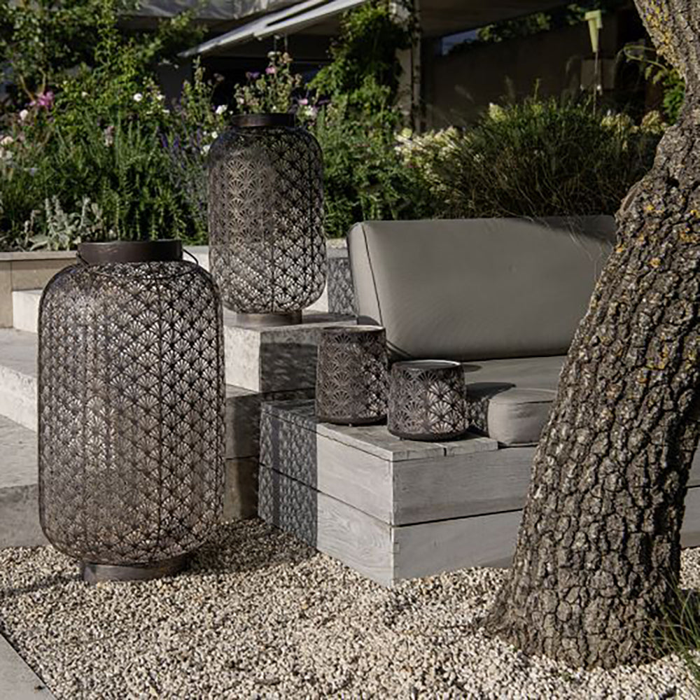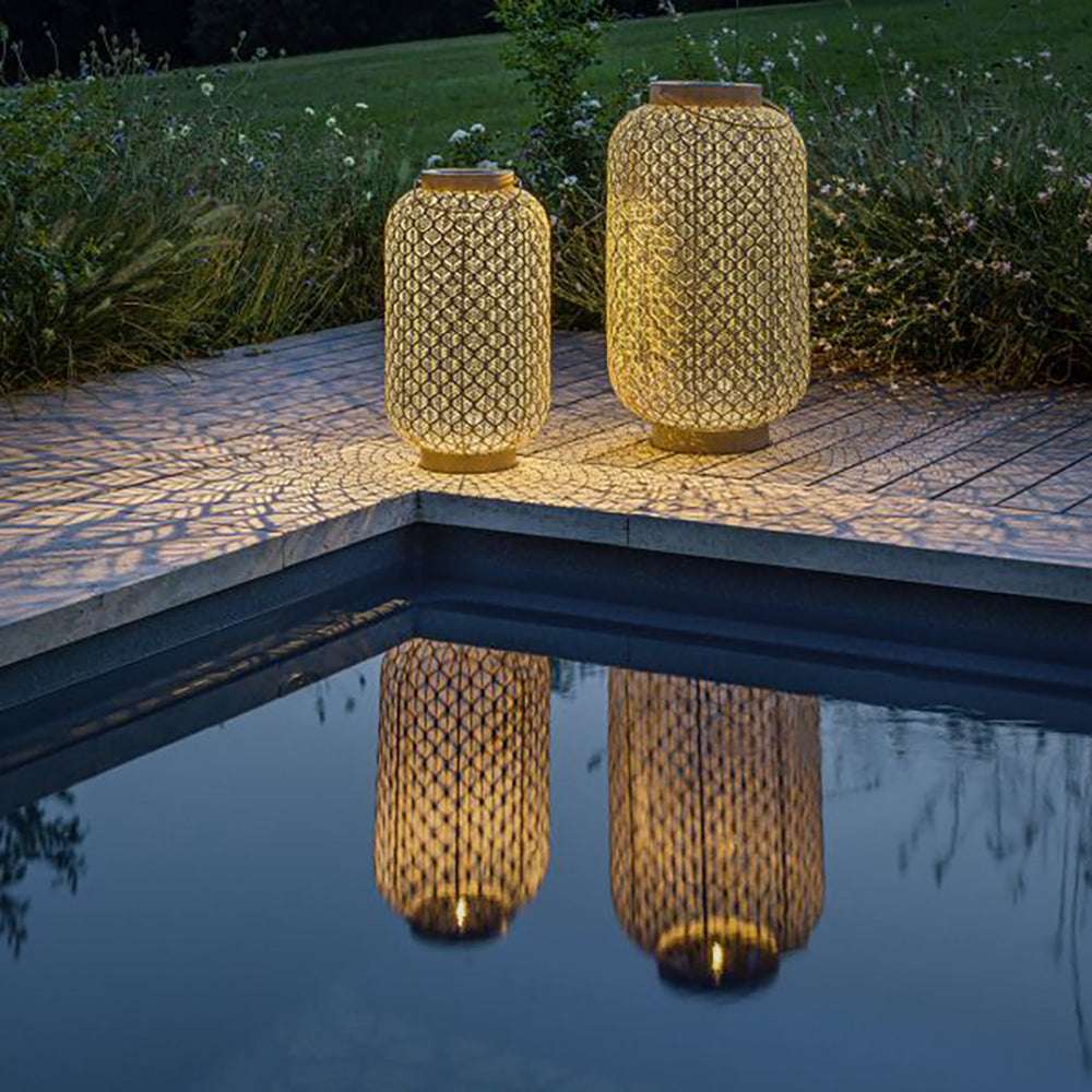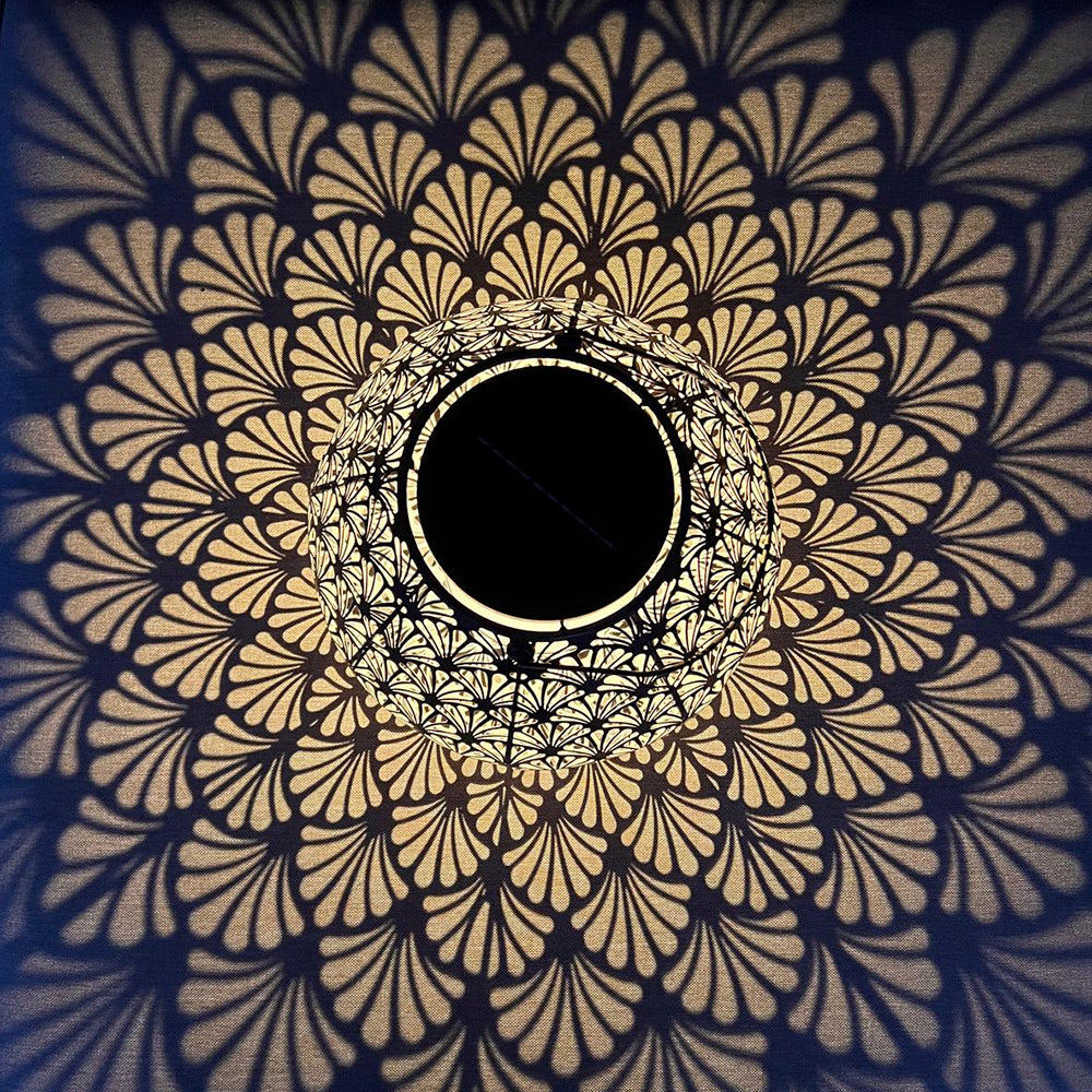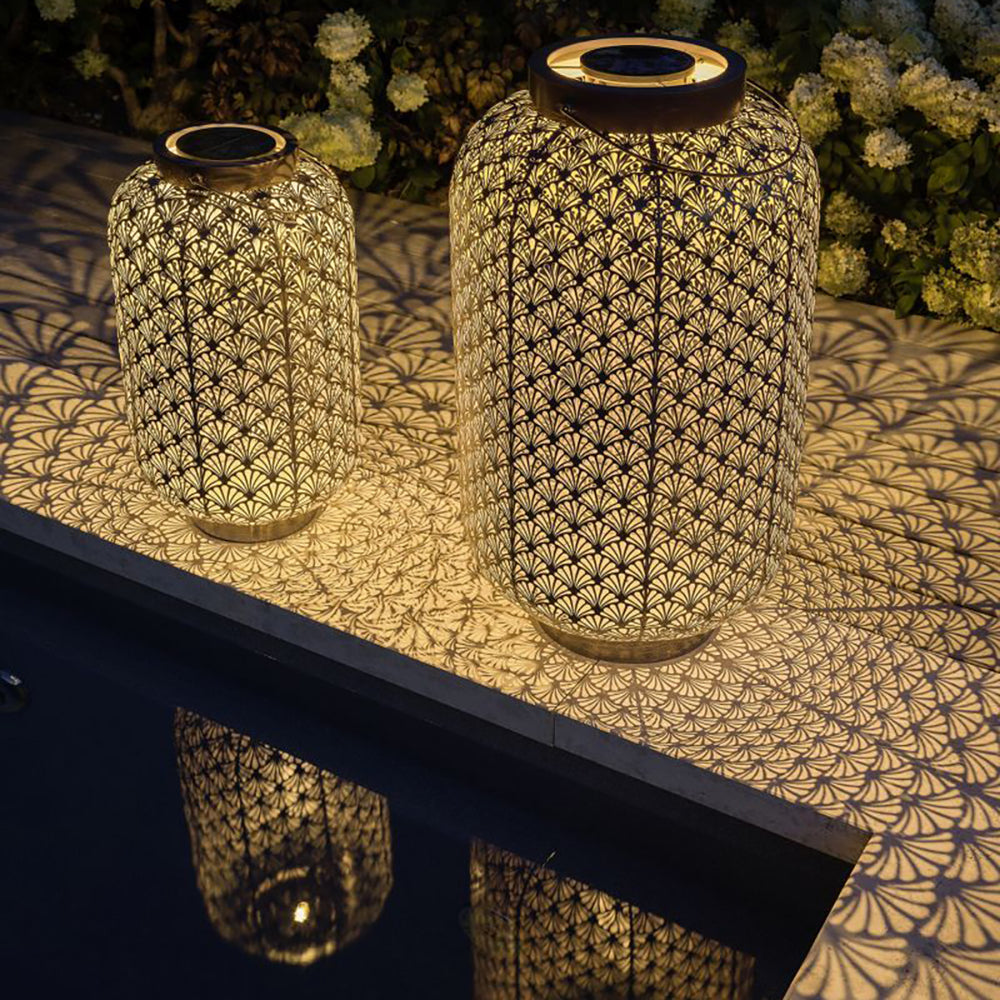 SOLAR-LATERNE GRAND 580 – ANTIC SANTANA – wunderschöne solarbetriebene Laterne für innen und aussen. Diese Laterne lädt sich im Verlaufe des Tages über das Solarpanel auf und schaltet sich am Abend bei Dämmerung automatisch ein. Das perforierte Metallgehäuse ergibt ein schönes Licht- und Schattenspiel. Die Solar-Laterne kann bei jeder Witterung draussen stehen bleiben. Empfohlen wird, das in den Wintermonate die Leuchte im Innenbereich verwendet wird, da die Batterie gegen Minusgrade nicht resistent ist.