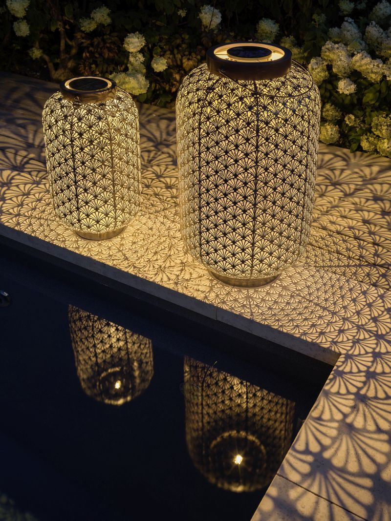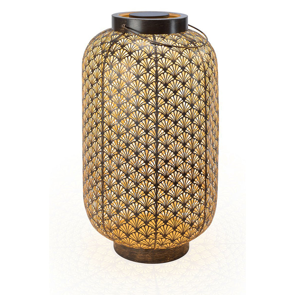 SOLAR-LATERNE GRAND 750 – ANTIC SANTANA – wunderschöne solarbetriebene Laterne für innen und aussen. Diese Laterne lädt sich im Verlaufe des Tages über das Solarpanel auf und schaltet sich am Abend bei Dämmerung automatisch ein. Das perforierte Metallgehäuse ergibt ein schönes Licht- und Schattenspiel. Die Solar-Laterne kann bei jeder Witterung draussen stehen bleiben. Empfohlen wird, das in den Wintermonate die Leuchte im Innenbereich verwendet wird, da die Batterie gegen Minusgrade nicht resistent ist.