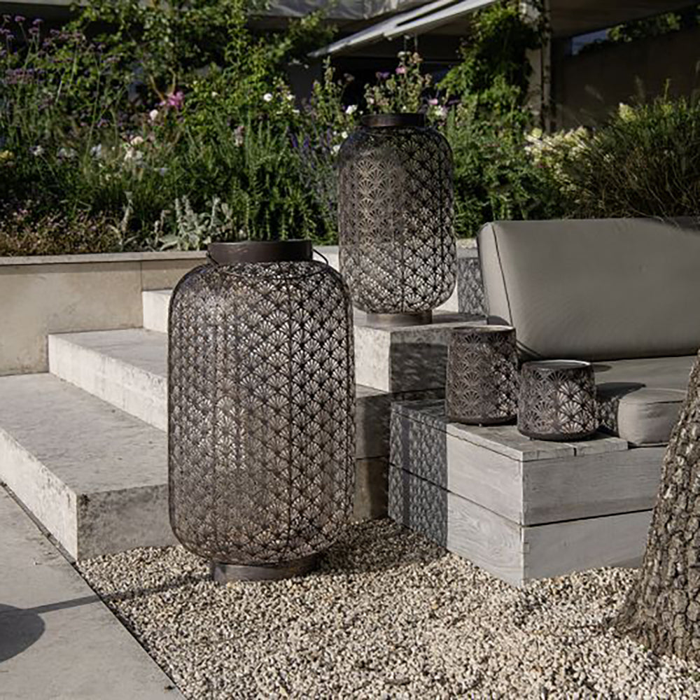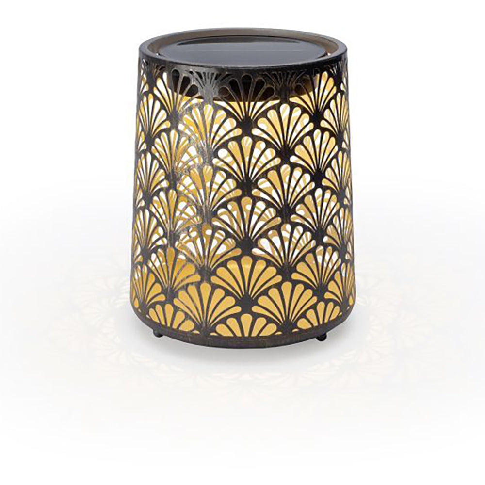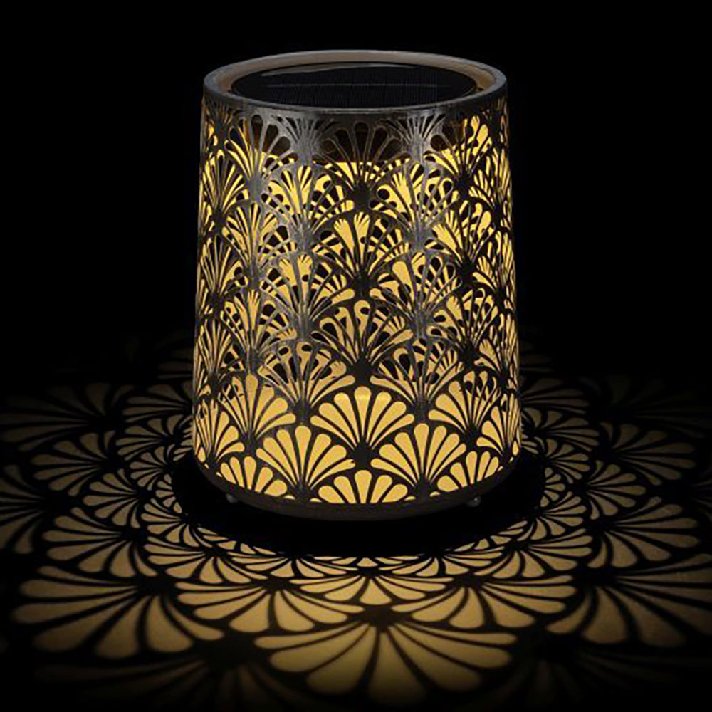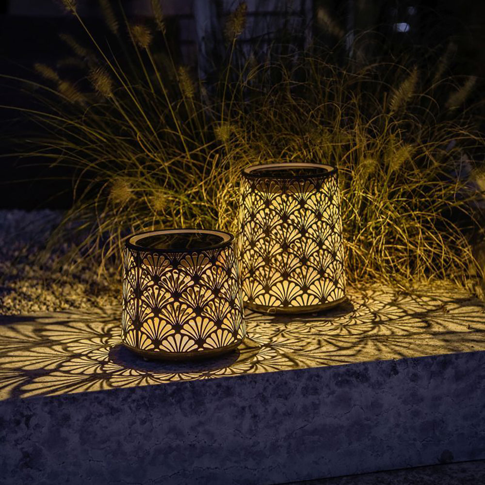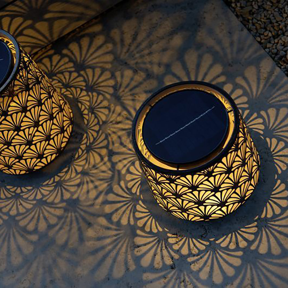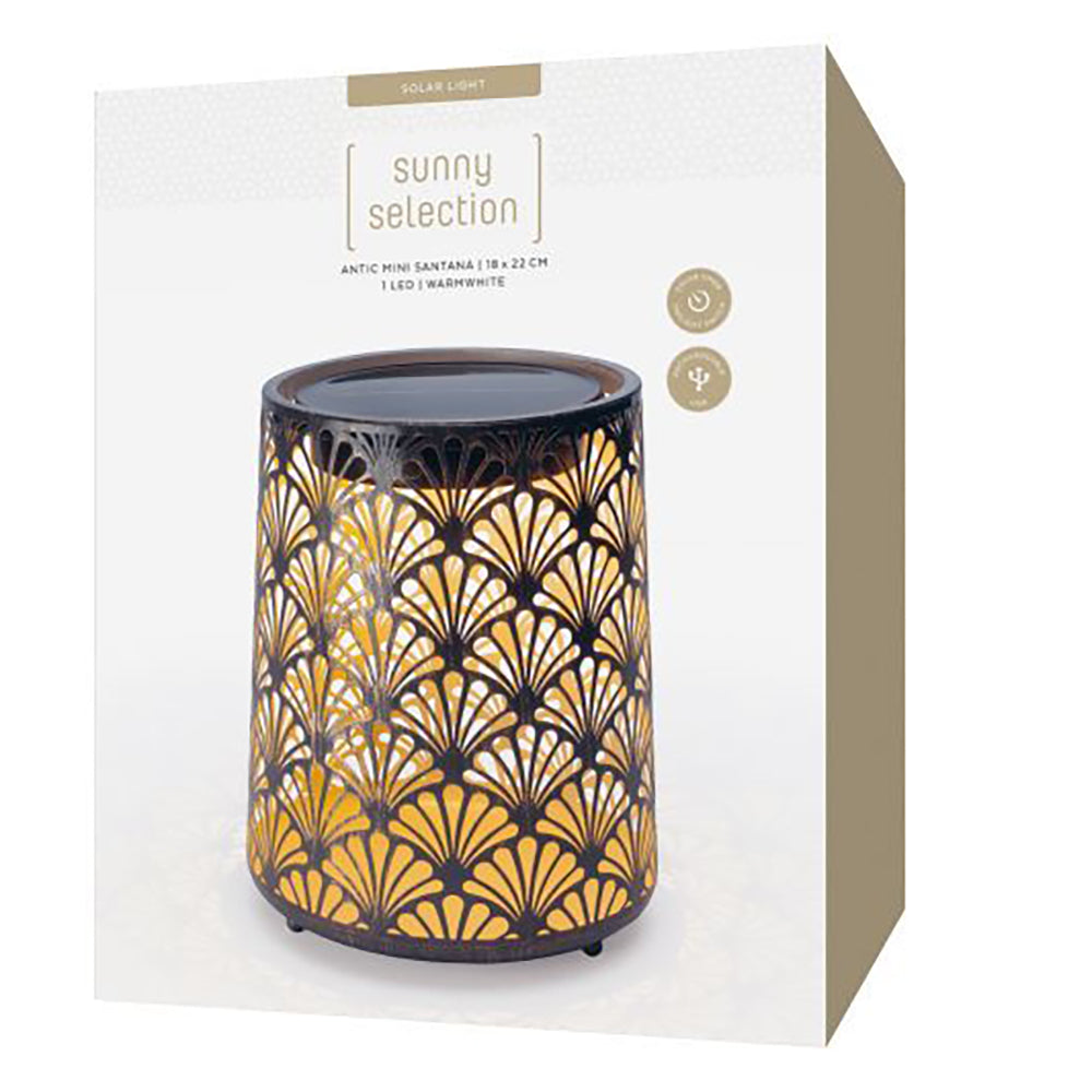 SOLAR MINI M – ANTIC SANTANA – wunderschöne solarbetriebene Laterne für innen und aussen. Diese Laterne lädt sich im Verlaufe des Tages über das Solarpanel auf und schaltet sich am Abend bei Dämmerung automatisch ein. Das perforierte Metallgehäuse ergibt ein schönes Licht- und Schattenspiel. Die Solar-Laterne kann bei jeder Witterung draussen stehen bleiben. Empfohlen wird, das in den Wintermonate die Leuchte im Innenbereich verwendet wird, da die Batterie gegen Minusgrade nicht resistent ist.
