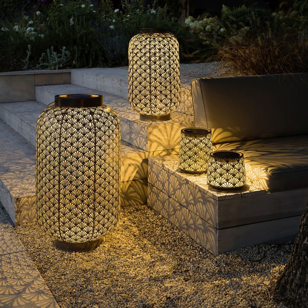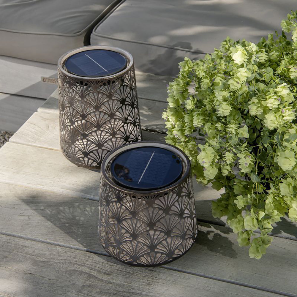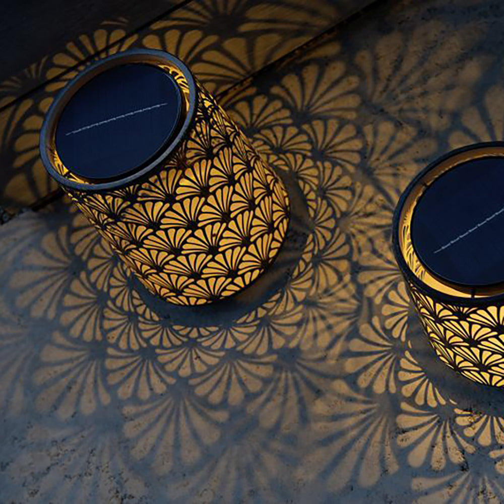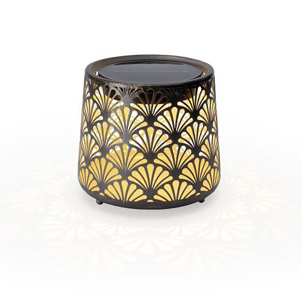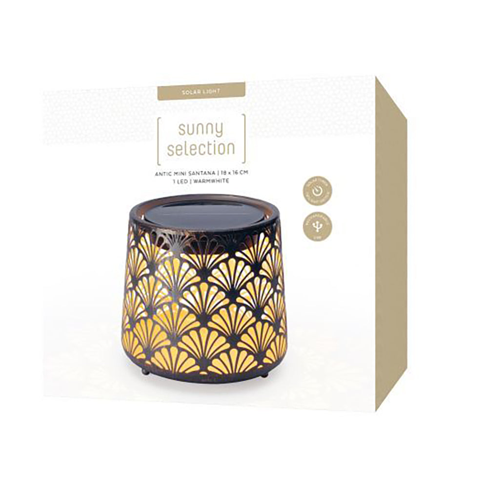 SOLAR MINI S – ANTIC SANTANA – wunderschöne solarbetriebene Laterne für innen und aussen. Diese Laterne lädt sich im Verlaufe des Tages über das Solarpanel auf und schaltet sich am Abend bei Dämmerung automatisch ein. Das perforierte Metallgehäuse ergibt ein schönes Licht- und Schattenspiel. Die Solar-Laterne kann bei jeder Witterung draussen stehen bleiben. Empfohlen wird, das in den Wintermonate die Leuchte im Innenbereich verwendet wird, da die Batterie gegen Minusgrade nicht resistent ist.
