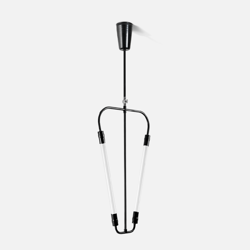 MANNHEIM PFEIL 2 HIGH - simple single-flame luminaire with proven standard fluorescent tube Metal parts made of refined sheet steel, deep black, electrics with low-loss ballast and starter in the canopy. The look is reminiscent of a modern interpretation of classic chandeliers and chandeliers.