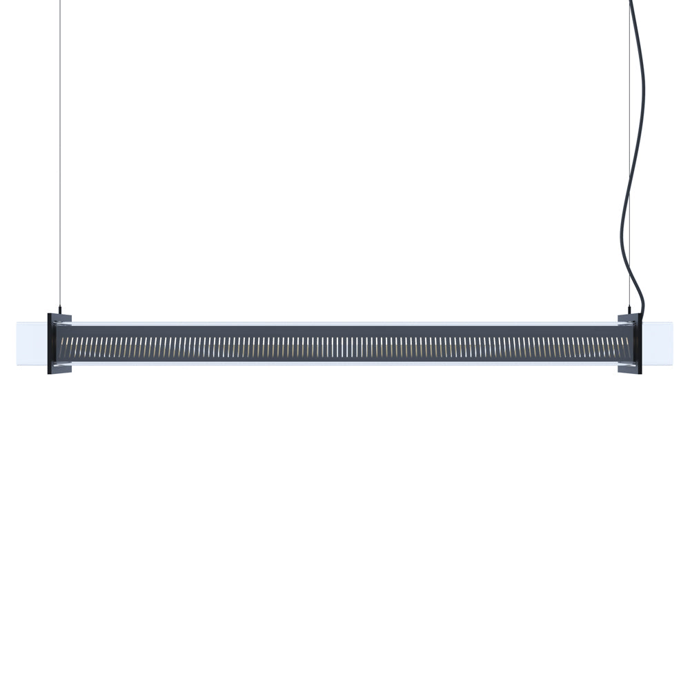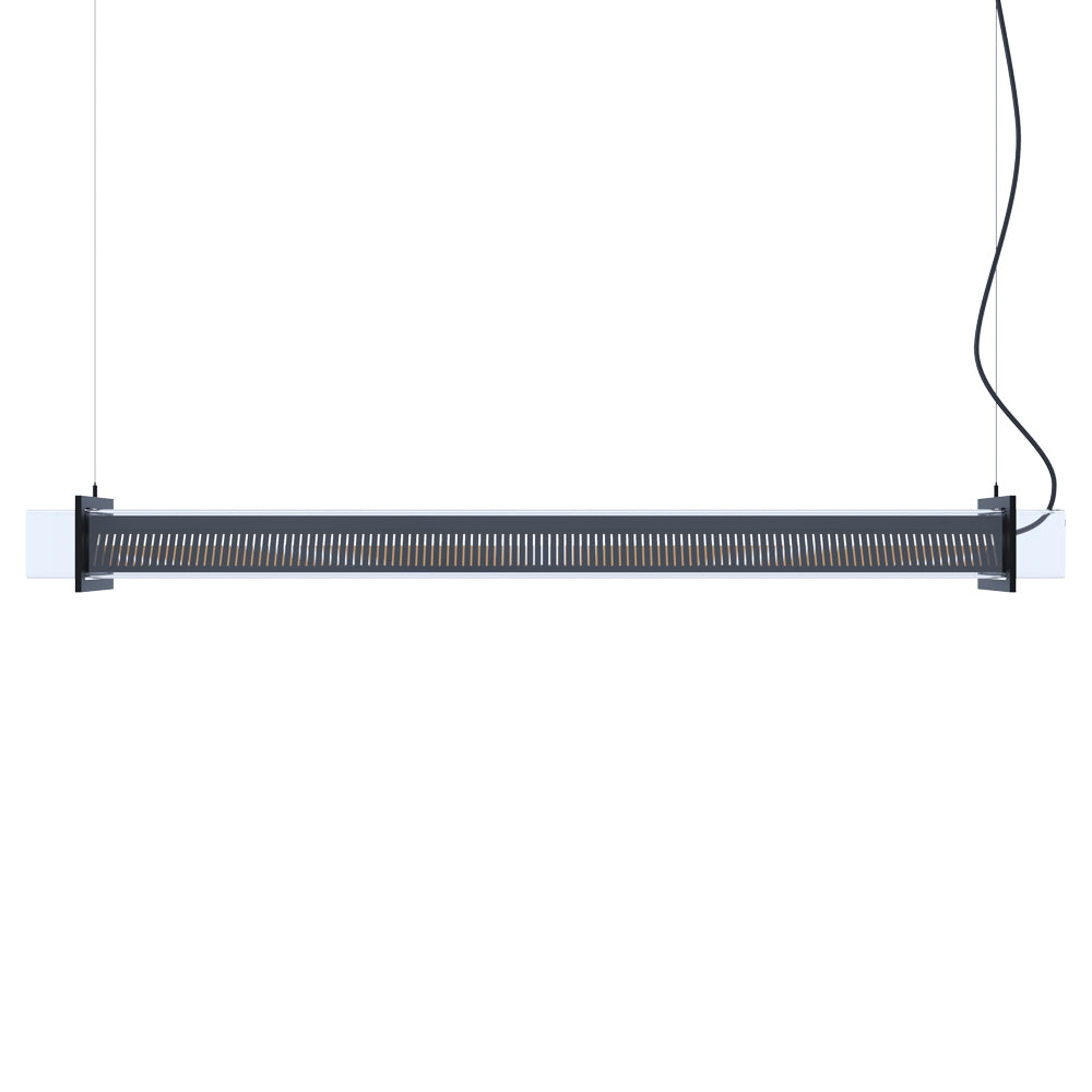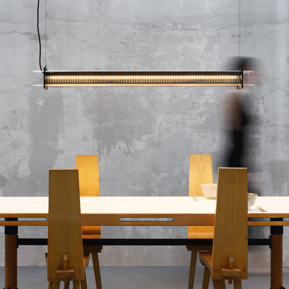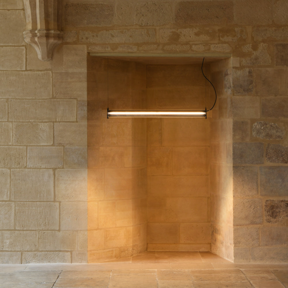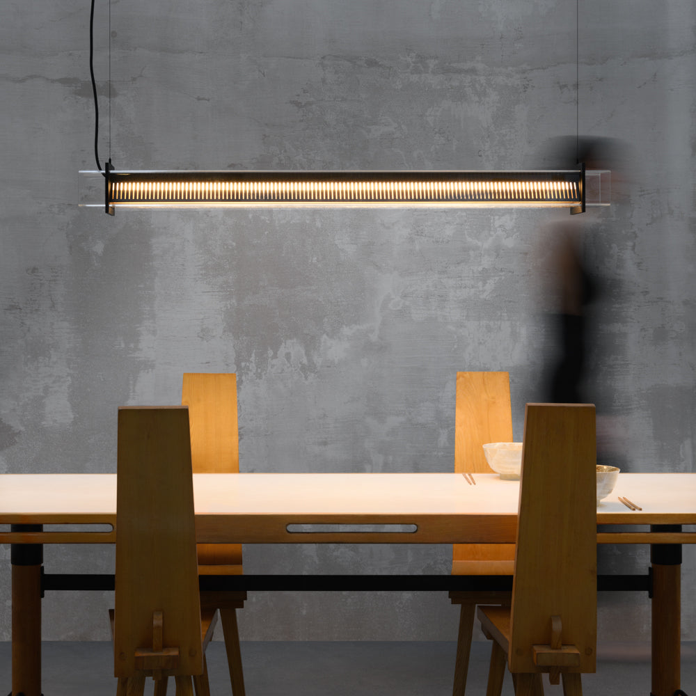 BRUEGHEL TUBE 1000 / TUBE LAMP - Whether hanging or mounted on the ceiling, thanks to its intense and directed light, this LED luminaire is ideal for optimal and precise illumination of horizontal surfaces. The lamellas used prevent glare and offer real visual working comfort. The BRUEGHEL tube light is mainly used in hallways, workplaces or kitchens. The dimmable version offers a variety of lighting situations. Suspended on the supplied steel cables, the lamp gives a feeling of lightness and finesse.