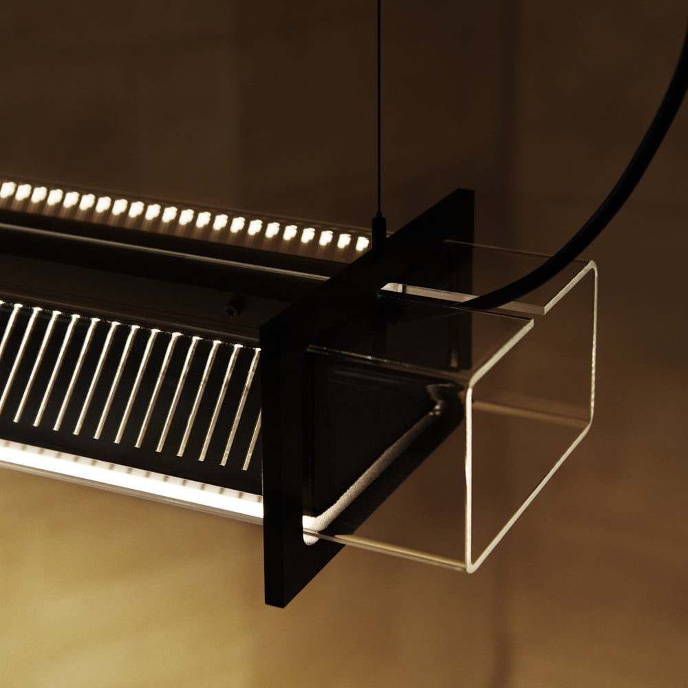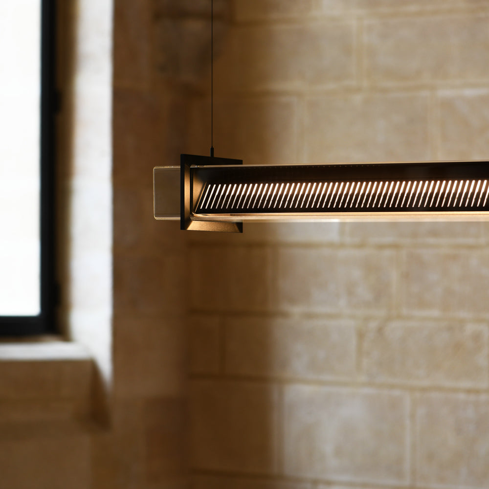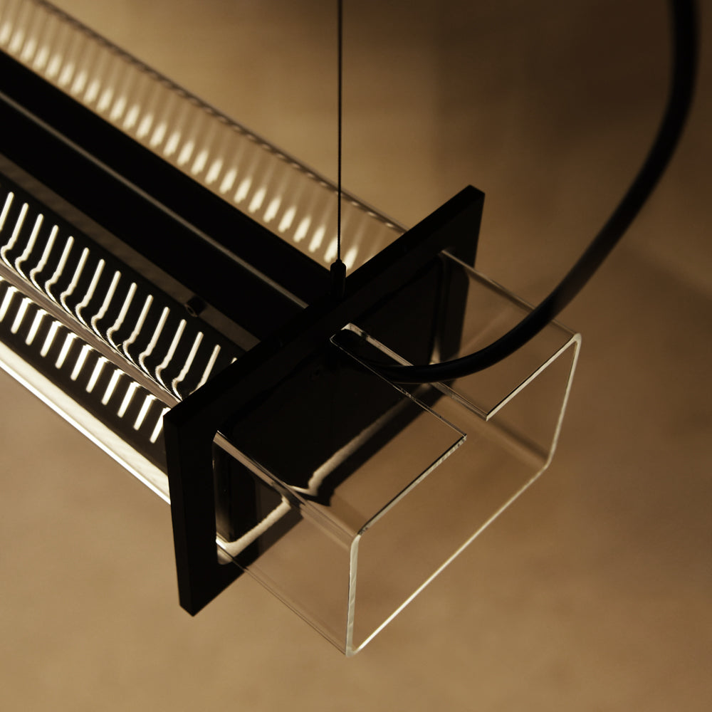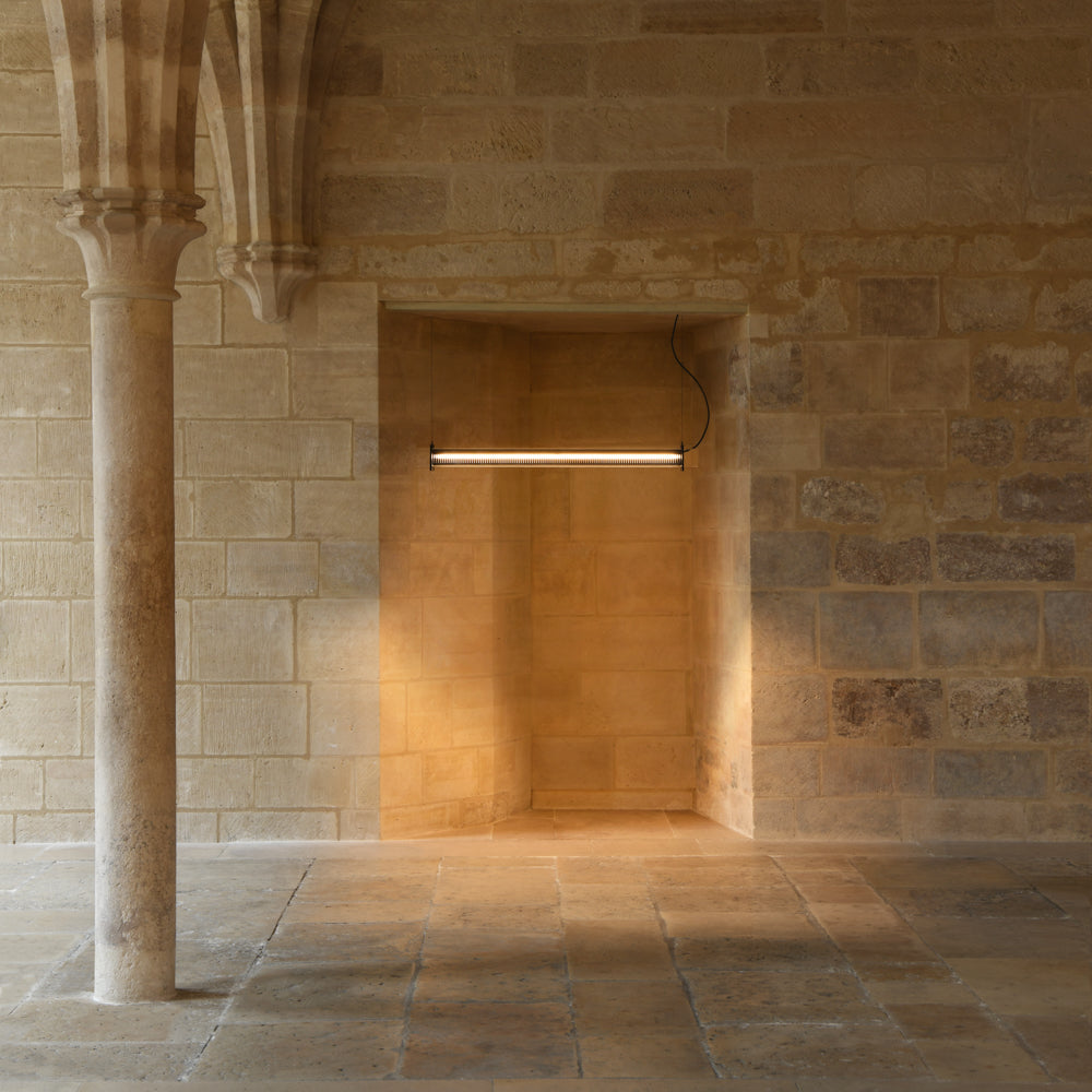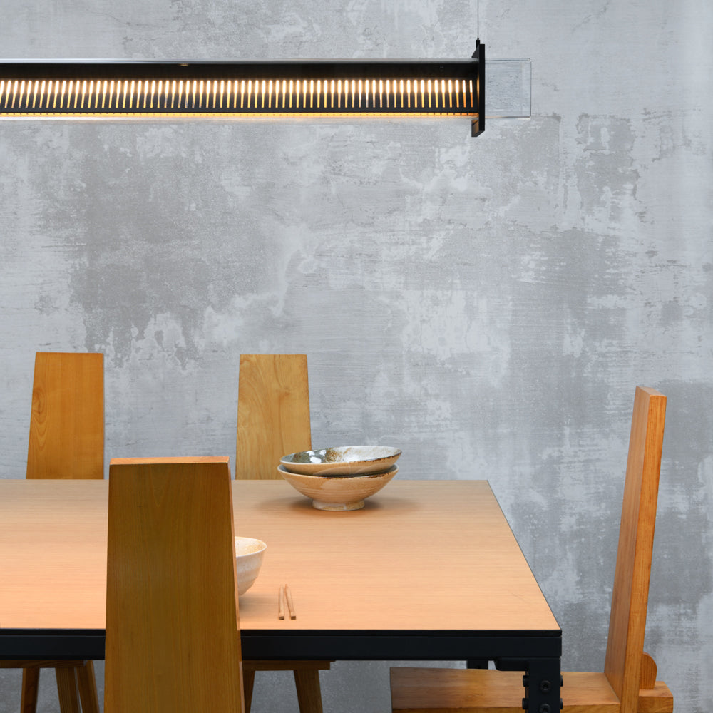 BRUEGHEL TUBE 1000 / TUBE LAMP - Whether hanging or mounted on the ceiling, thanks to its intense and directed light, this LED luminaire is ideal for optimal and precise illumination of horizontal surfaces. The lamellas used prevent glare and offer real visual working comfort. The BRUEGHEL tube light is mainly used in hallways, workplaces or kitchens. The dimmable version offers a variety of lighting situations. Suspended on the supplied steel cables, the lamp gives a feeling of lightness and finesse.