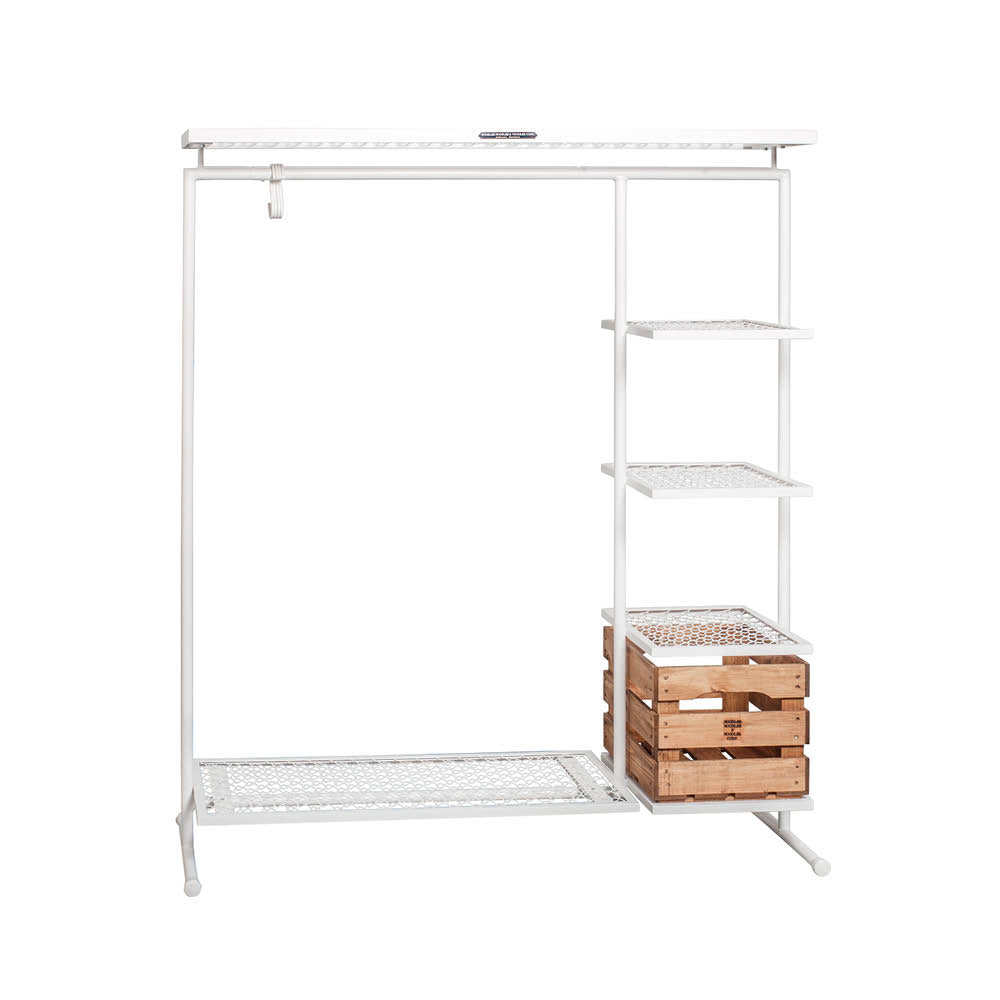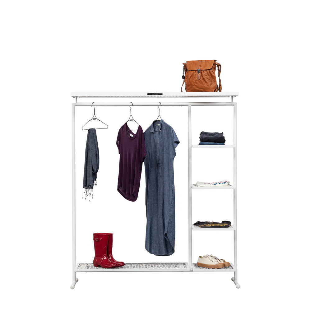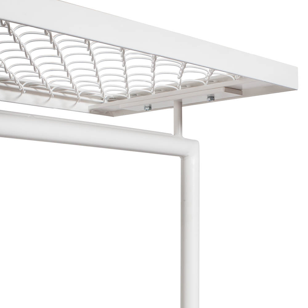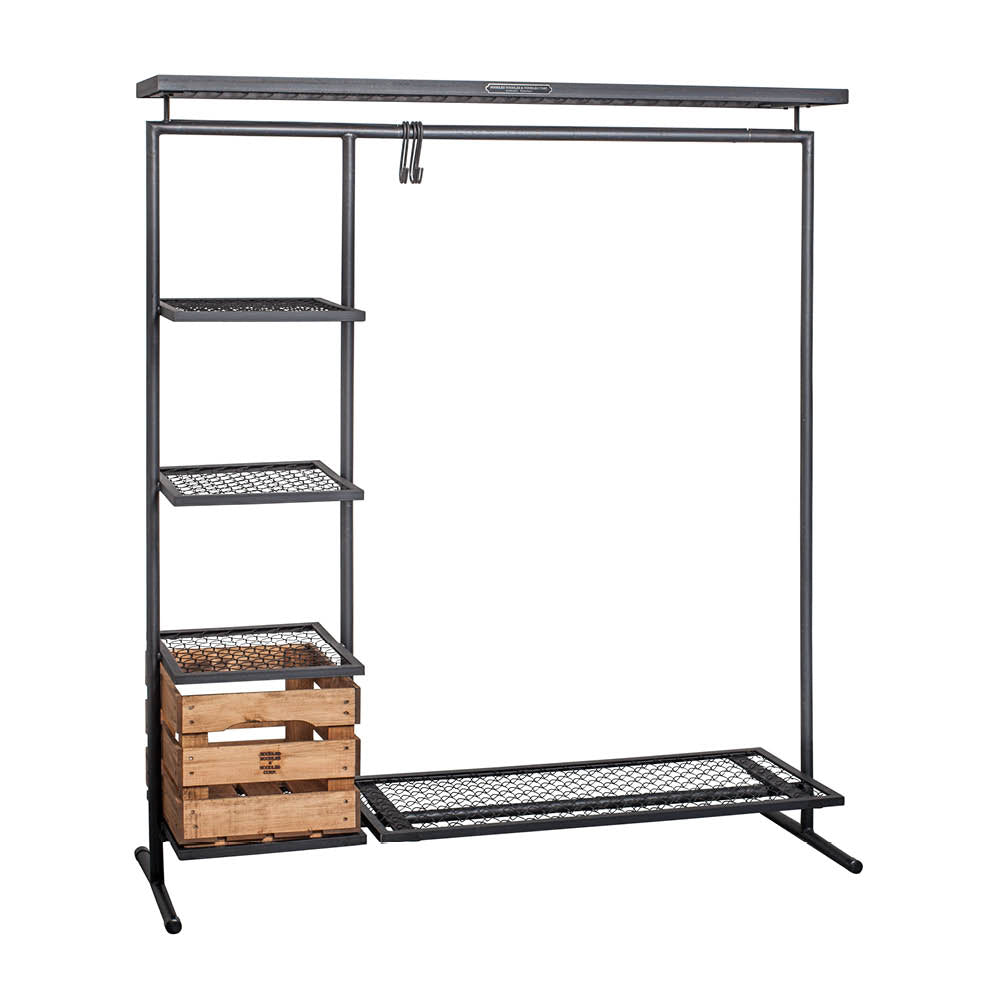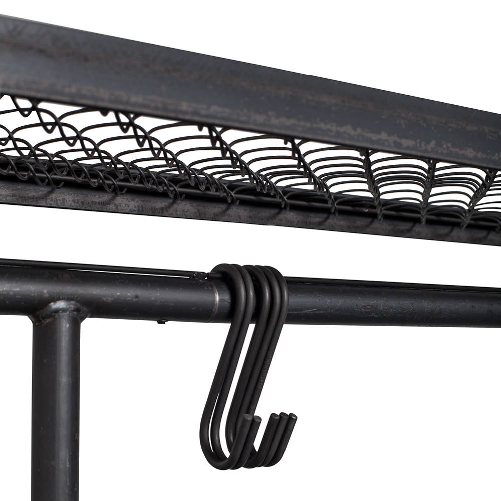 The clothes rack Type 2 offers space for the decorative storage of clothing. It's practical and looks good. The wire mesh shelves define an unmistakable industrial look. The upper shelf is 35 cm deep, depending on the version, 120 or 140 cm wide. The lower shelf is 130 or 110 cm wide and 46 cm deep. In order to be able to hang up the clothing in proper style, it is best to order coat hangers and hooks from our range.