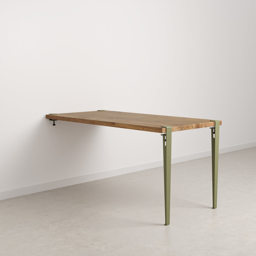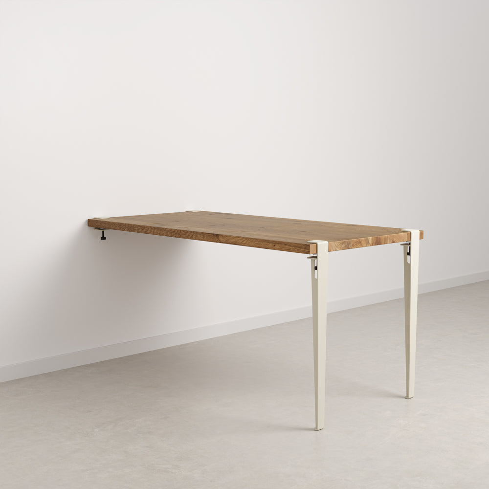 Le panneau en chêne est fabriqué en France et le bois est issu de forêts 100% gérées durablement (label PEFC). Les pieds de 110 cm et le support mural peuvent être montés ou démontés à nouveau en quelques minutes grâce aux vis de serrage et rangés pour gagner de la place.
