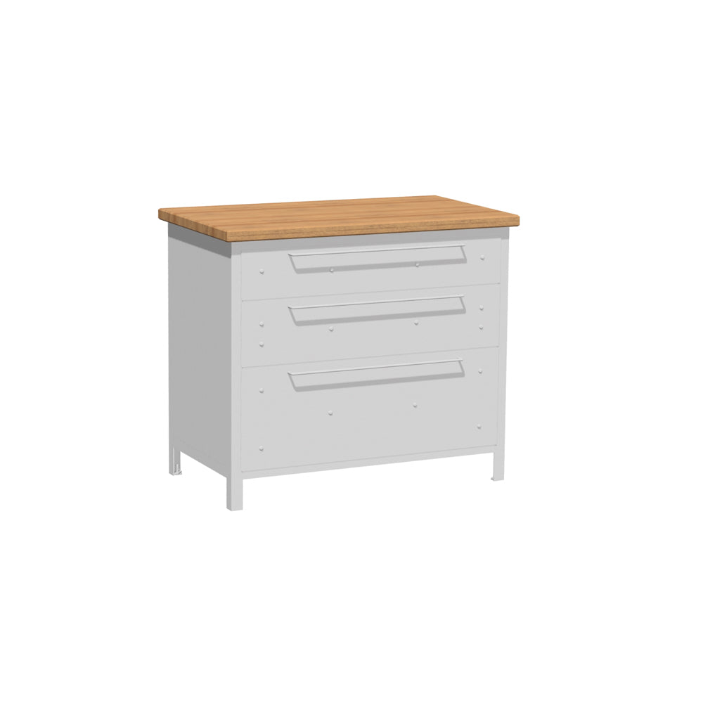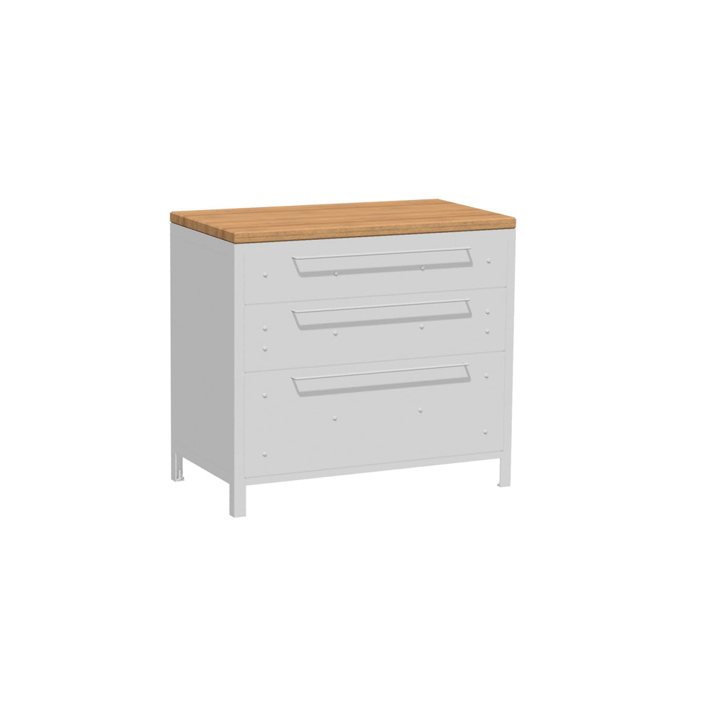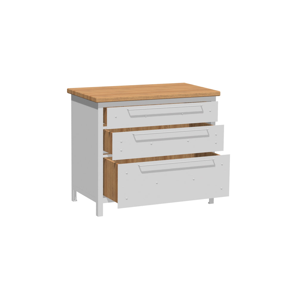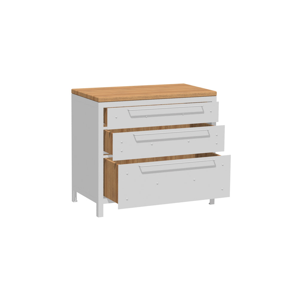 Meuble à tiroirs A. Corps en acier composé d'angles. Trois tiroirs de tailles différentes. La façade en acier avec les rivets typiques, le tiroir lui-même en bois massif. L'armoire à tiroirs peut être combinée avec d'autres meubles de cuisine Noodles, puis transformée en une seule unité avec un plan de travail continu. Peut être commandé avec ou sans plan de travail. La hauteur du corps en métal est de 87 cm. Support ferme même sur des sols irréguliers grâce aux pieds réglables en hauteur.