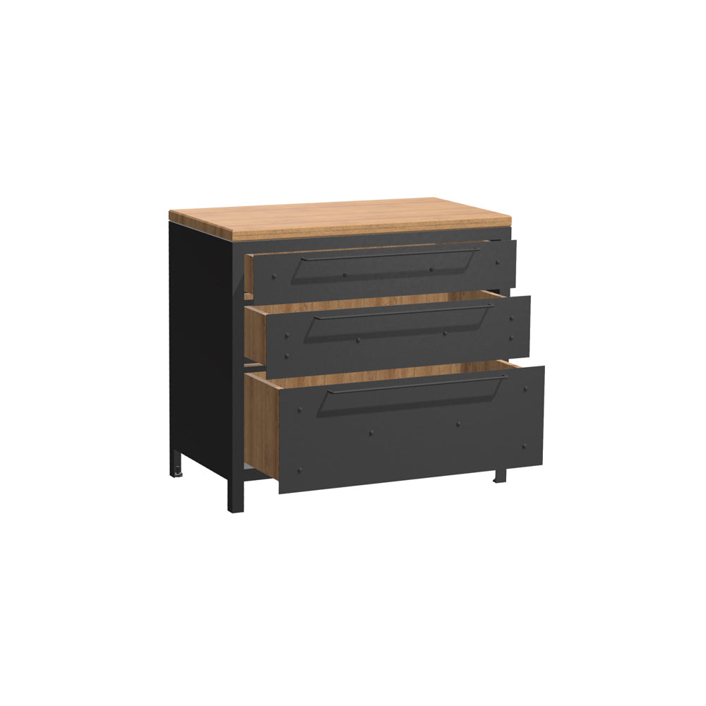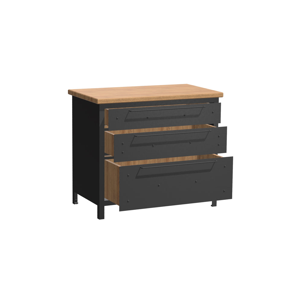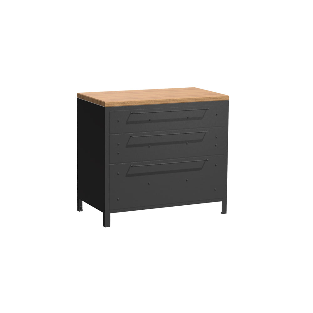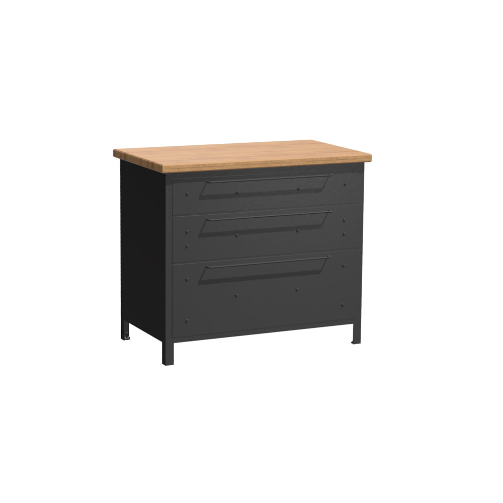 ARMOIRE À TIROIRS A100 - par Noodles Noodles. Armoire à tiroirs solide faite d'angles en acier, de rivets et de tôle d'acier avec trois tiroirs en bois de différentes hauteurs. Fabriqué en acier foncé avec une couche typique de tartre et un joint transparent. Alternativement avec une finition satinée en blanc pur. La surface laquée est robuste et facile d'entretien. Le tiroir meuble peut être intégré dans un meuble de cuisine ou autonome. Peut être utilisé de manière flexible dans la cuisine interne, les espaces de coworking, la cuisine de café de bureau, la gastronomie, etc.