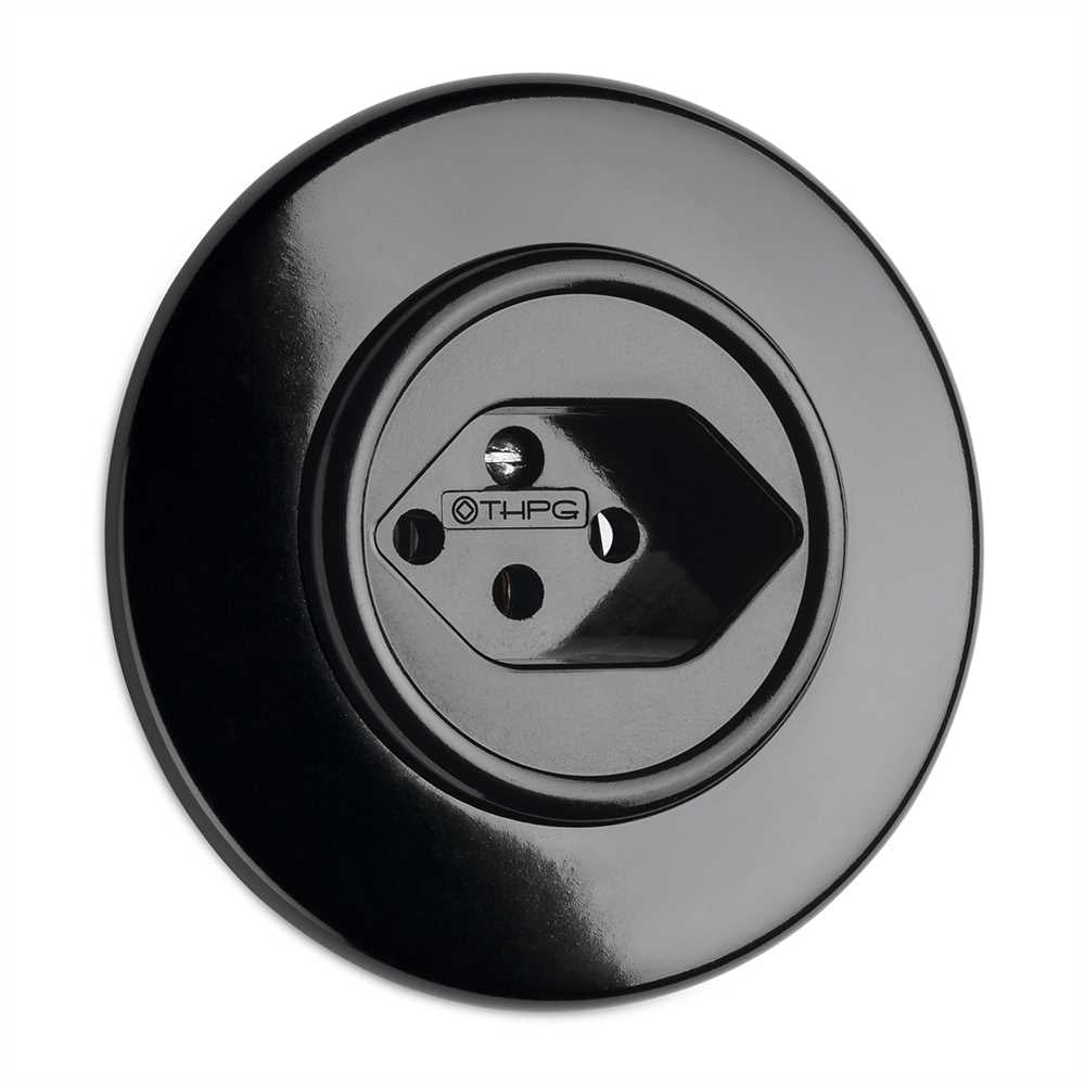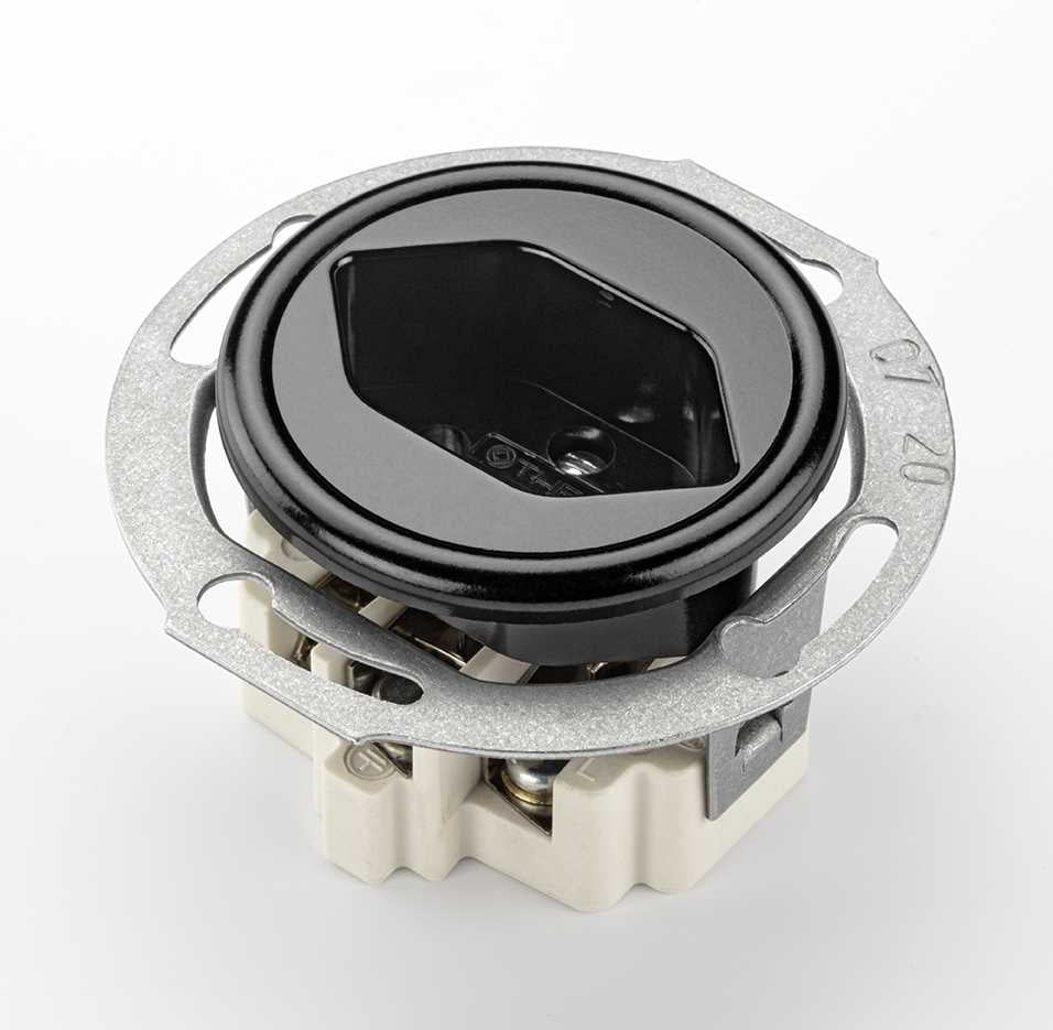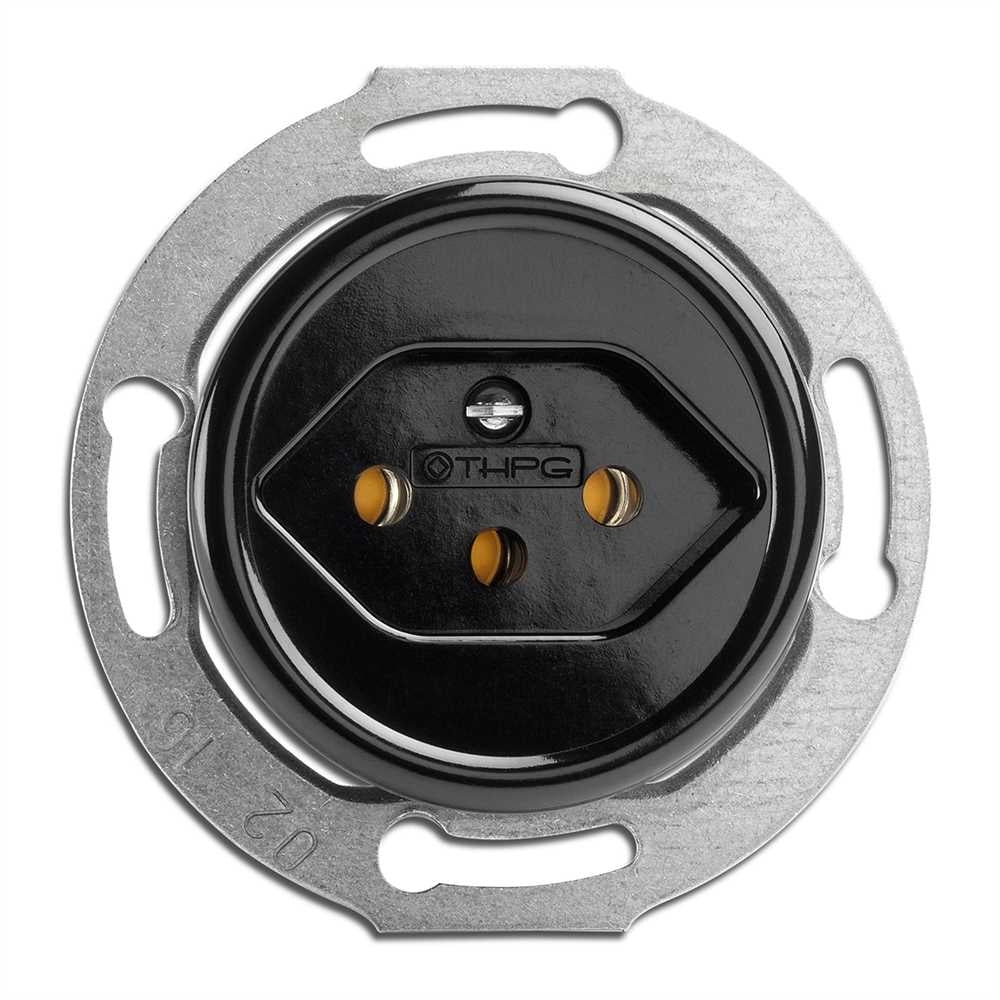 Douille de type 13, norme suisse, avec contact de protection pour interrupteurs en porcelaine. Bornes à vis pleines. Insert central en bakélite, corps de base en plastique thermodurcissable noir.