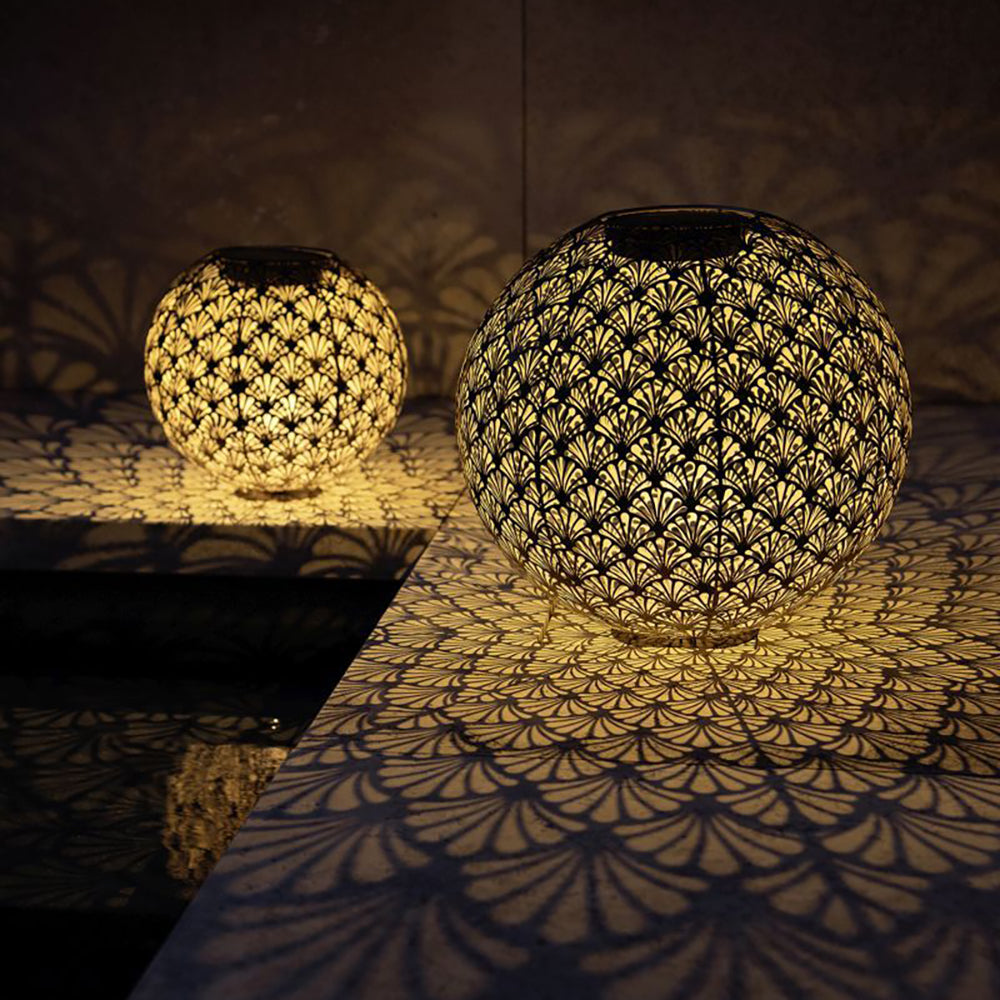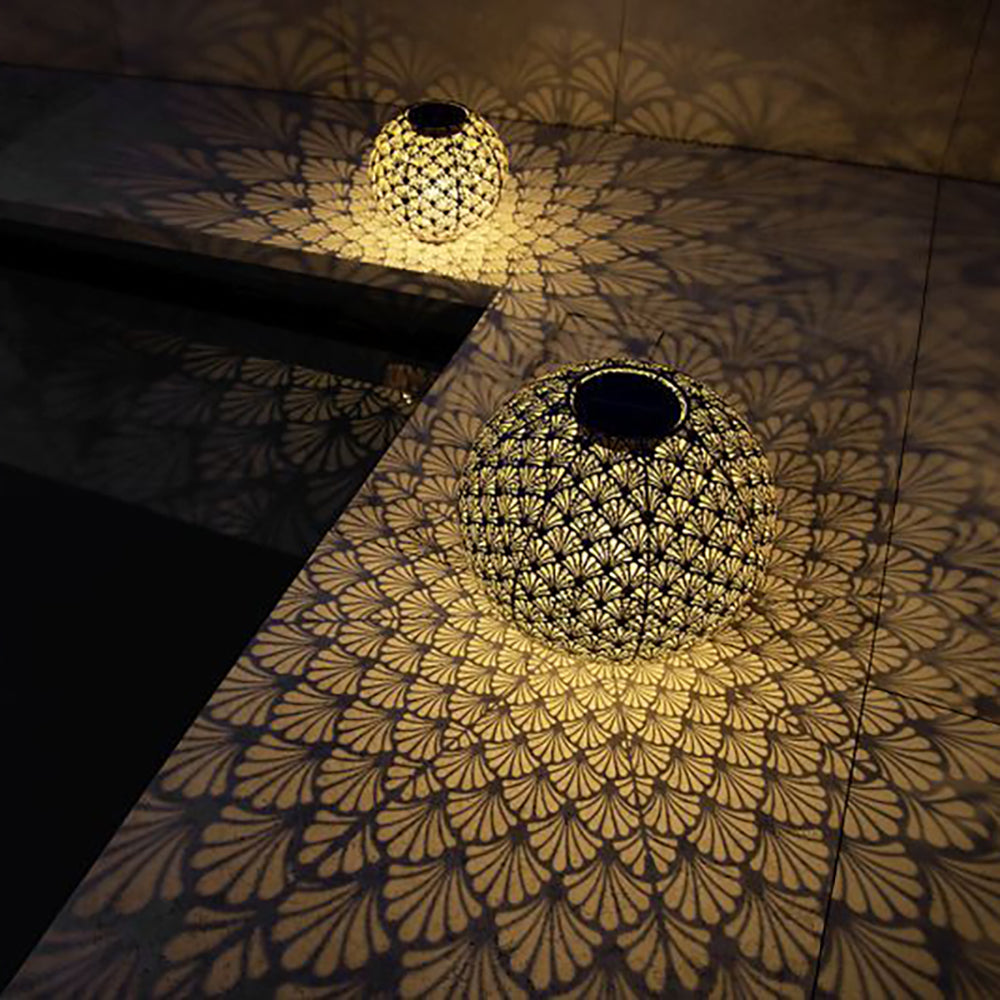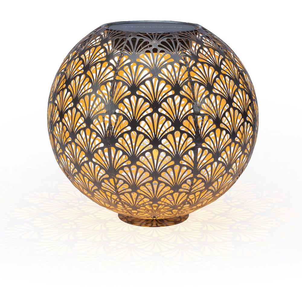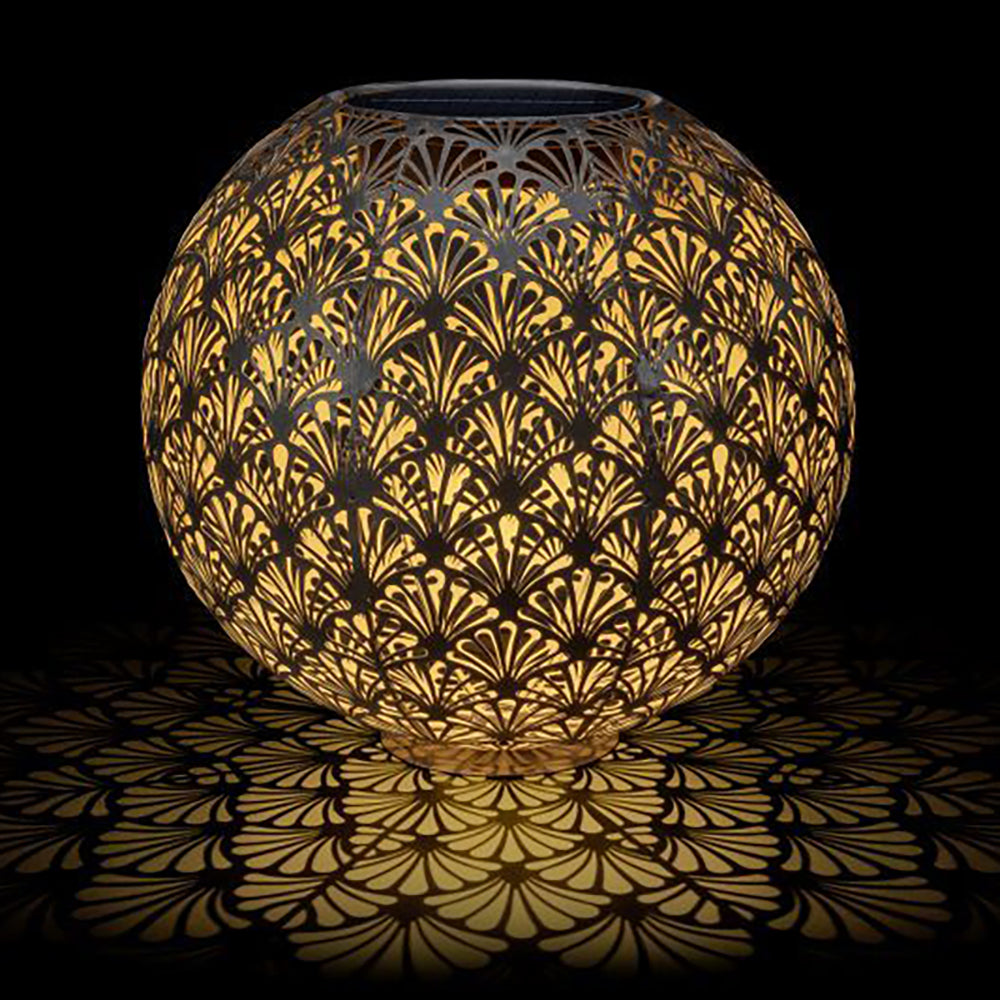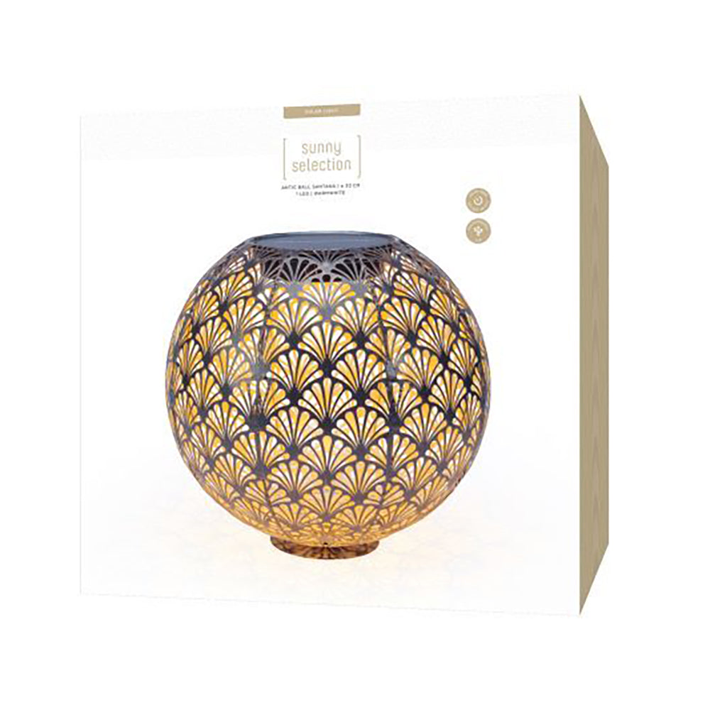 SOLAR-BALL 300 – ANTIC SANTANA – belle boule lumineuse à énergie solaire pour l'intérieur et l'extérieur. Cette lampe solaire se charge tout au long de la journée via le panneau solaire et s'allume automatiquement le soir au crépuscule. Le boîtier en métal perforé crée un magnifique jeu d'ombre et de lumière. La lampe solaire peut être laissée dehors par tous les temps. Il est recommandé d'utiliser la lampe à l'intérieur pendant les mois d'hiver car la batterie ne résiste pas aux températures inférieures à zéro.