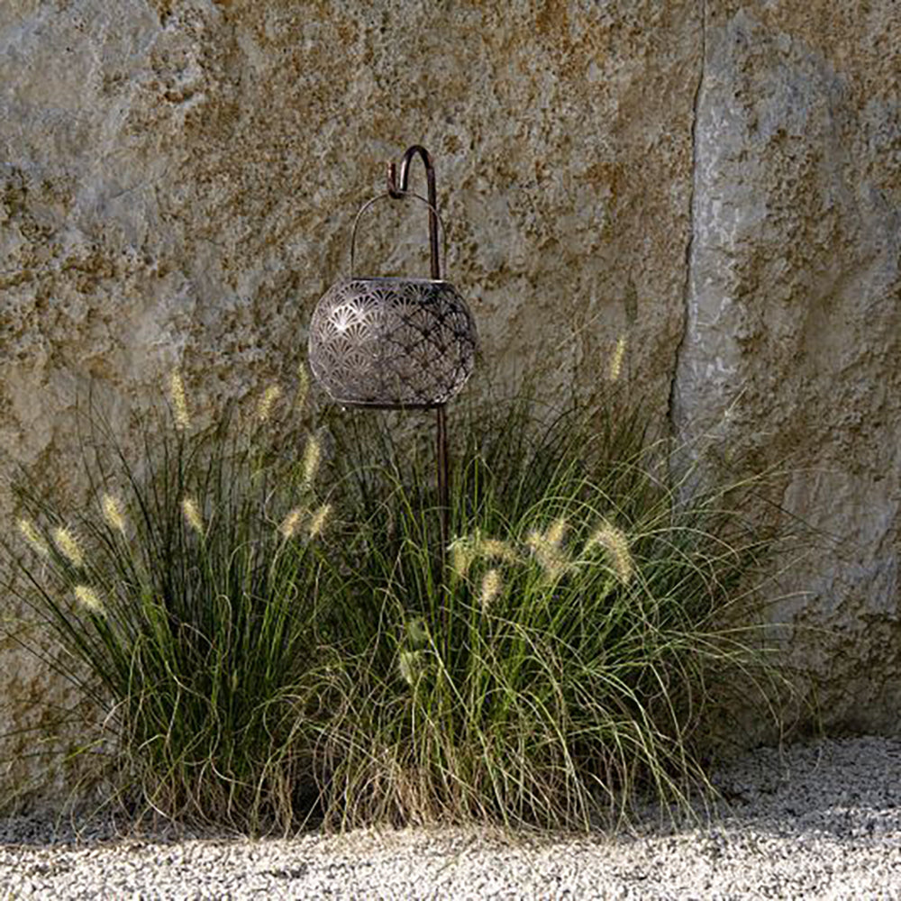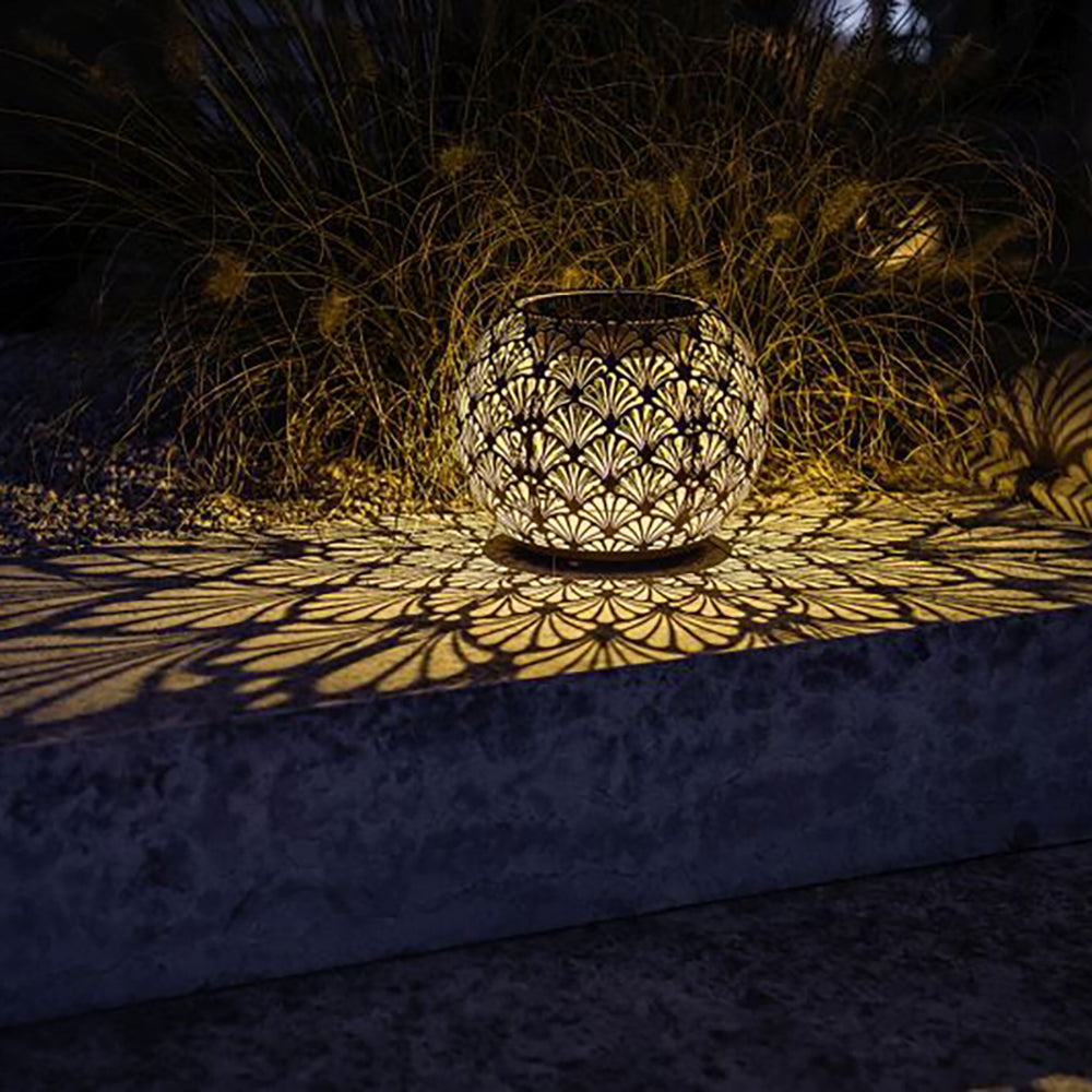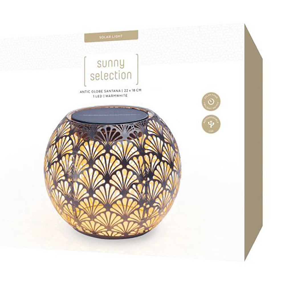 SOLAR-GLOBE 220 – ANTIC SANTANA – belle boule lumineuse à énergie solaire pour l'intérieur et l'extérieur. Cette lampe solaire se charge tout au long de la journée via le panneau solaire et s'allume automatiquement le soir au crépuscule. Le boîtier en métal perforé crée un magnifique jeu d'ombre et de lumière. La lampe solaire peut être laissée dehors par tous les temps. Il est recommandé d'utiliser la lampe à l'intérieur pendant les mois d'hiver car la batterie ne résiste pas aux températures inférieures à zéro.
