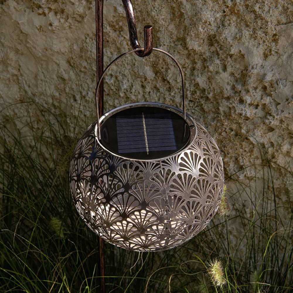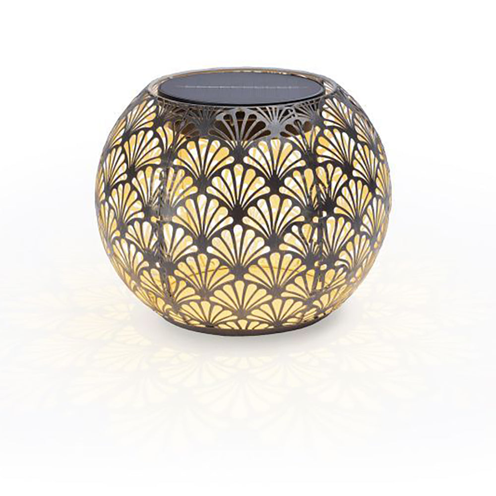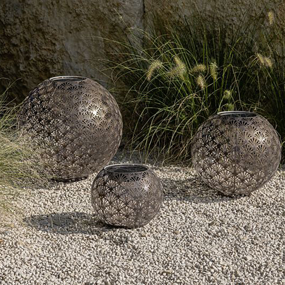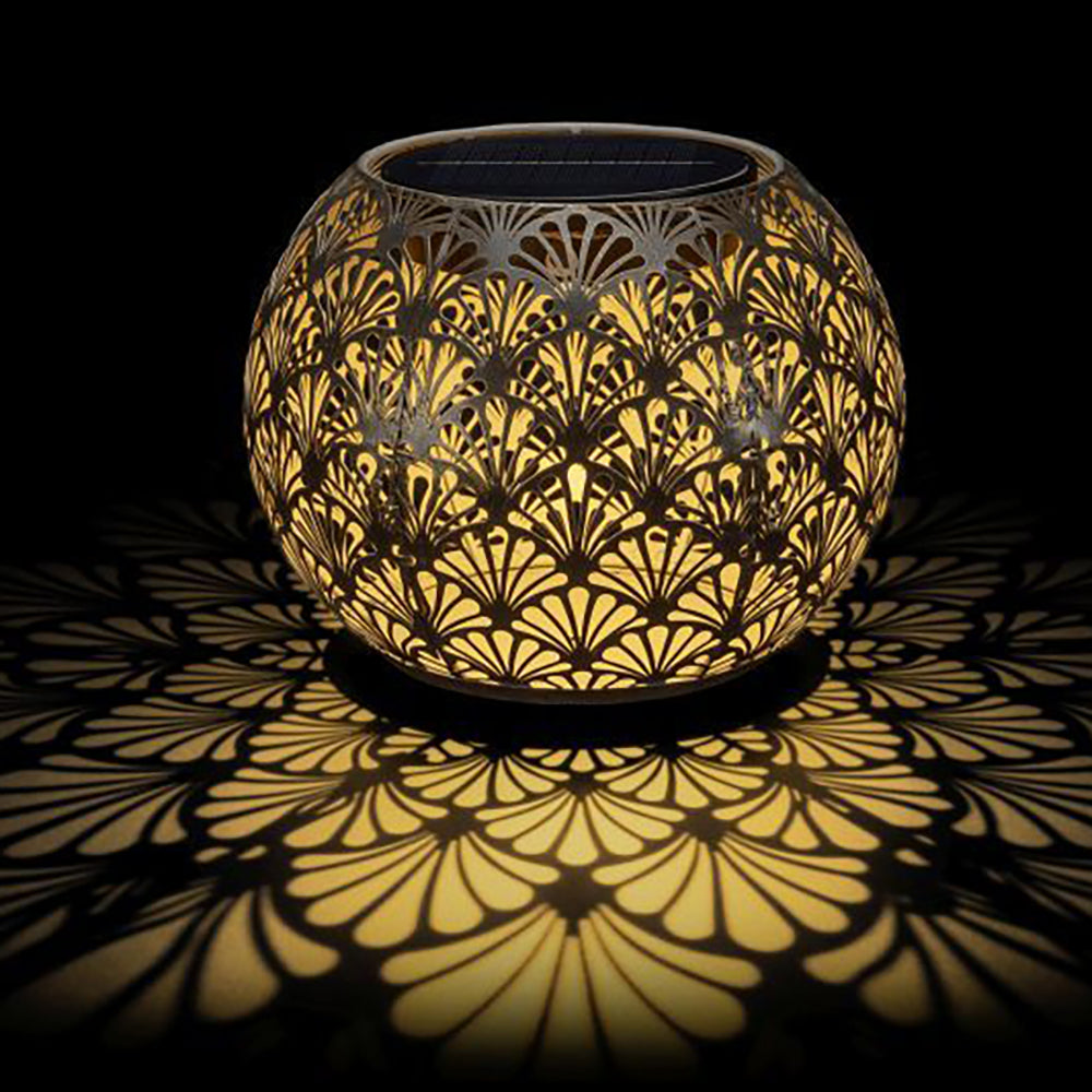 SOLAR-GLOBE 220 – ANTIC SANTANA – belle boule lumineuse à énergie solaire pour l'intérieur et l'extérieur. Cette lampe solaire se charge tout au long de la journée via le panneau solaire et s'allume automatiquement le soir au crépuscule. Le boîtier en métal perforé crée un magnifique jeu d'ombre et de lumière. La lampe solaire peut être laissée dehors par tous les temps. Il est recommandé d'utiliser la lampe à l'intérieur pendant les mois d'hiver car la batterie ne résiste pas aux températures inférieures à zéro.
