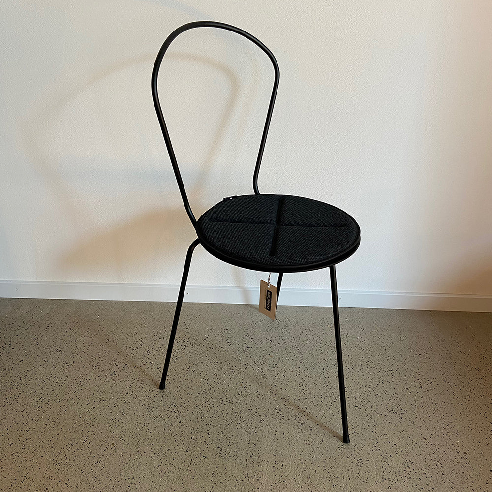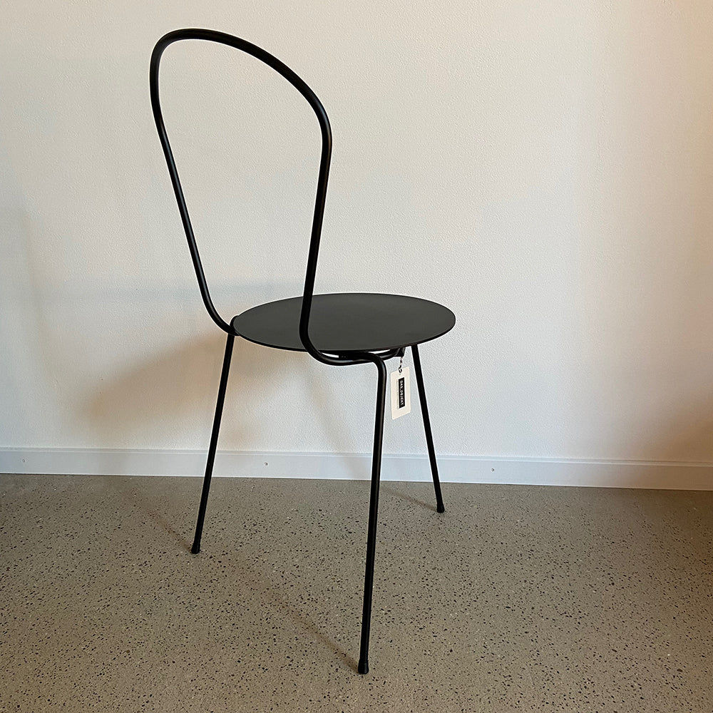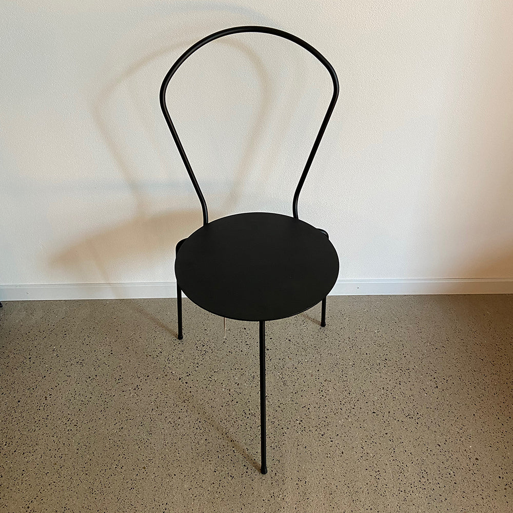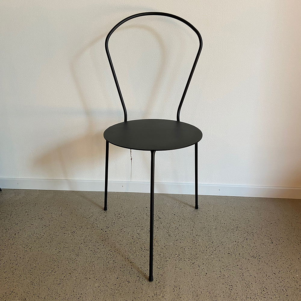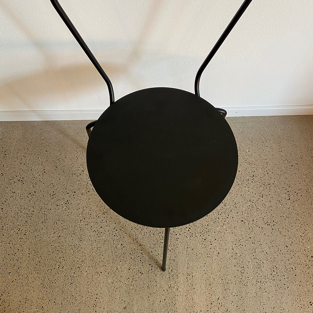 L'ASSIE – DER STUHL (EINZELSTÜCK) von Airborne (Chair / Chaise) aus schwarz lackiertem Stahl für Innen- und Aussenbereich. Das Stahlgestell (Ø 12mm) ist filigran, dennoch stabil und zerlegbar. Sehr eleganter und komfortabler Stuhl für Restaurants, Gartenwirtschaft, Terrasse, Garten, Balkon, Esszimmer und Wartezimmer.