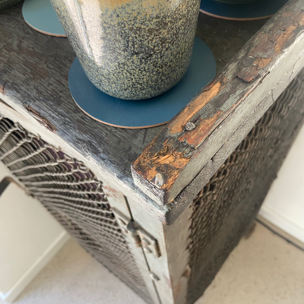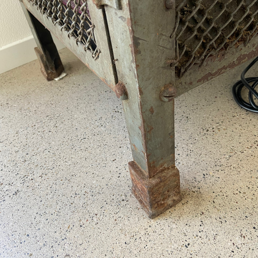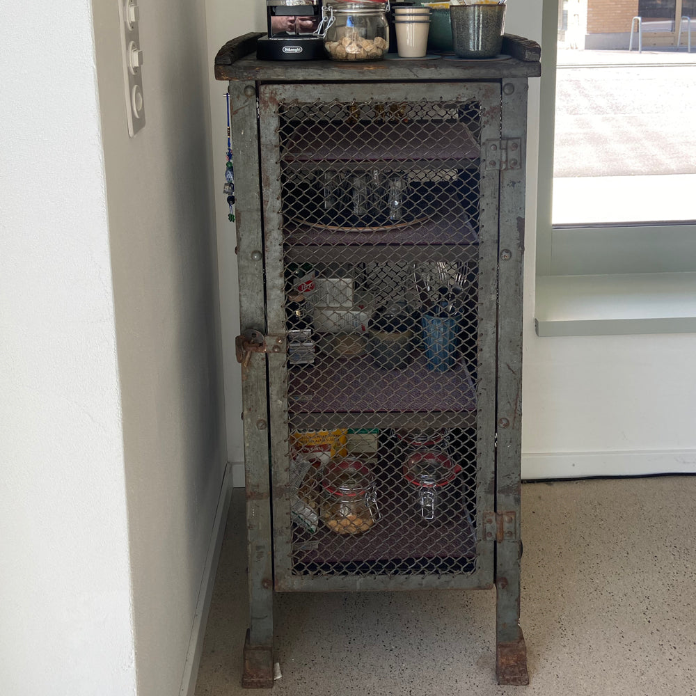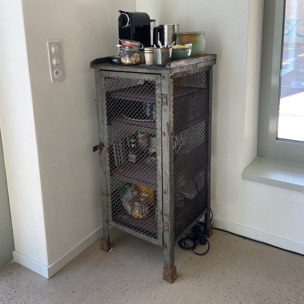 VINTAGE INDUSTRIAL MESH REGAL - sehr gut erhaltene Vintage, Metall Sideboard mit Maschendraht aus einer Werkstatt, militärgrün, Marke unbekannt.